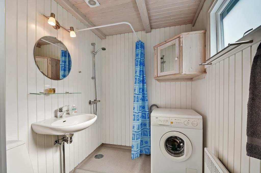 Badeværelse med bruser og vaskemaskine