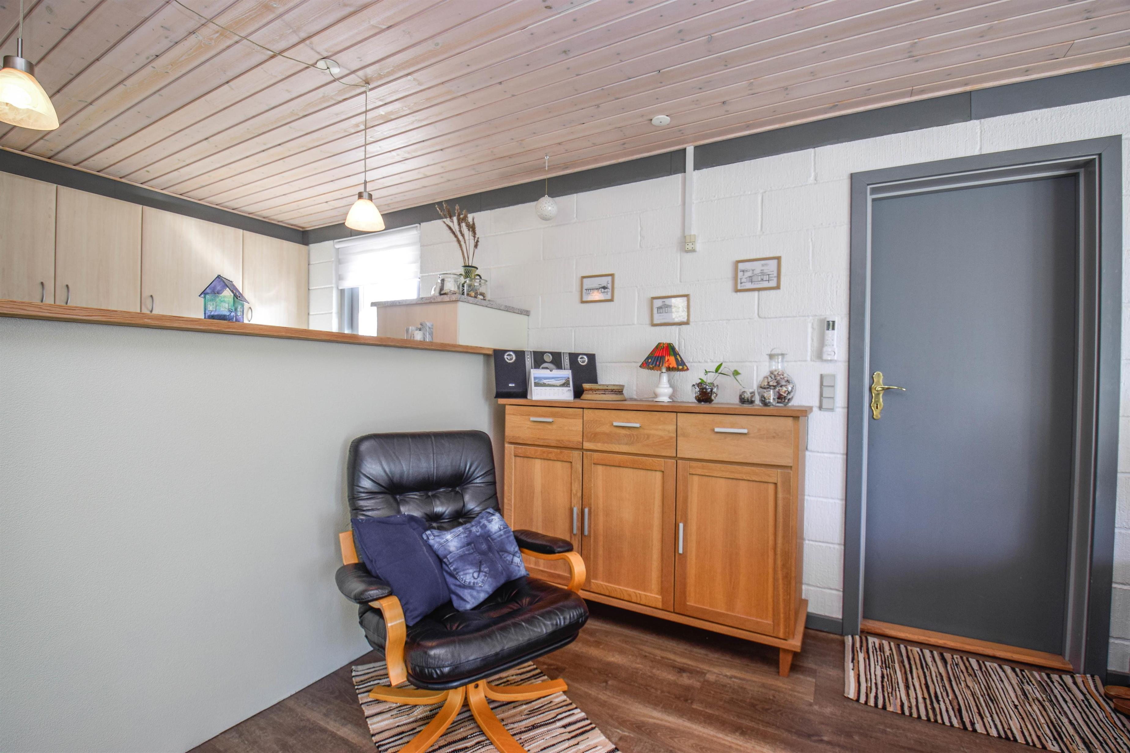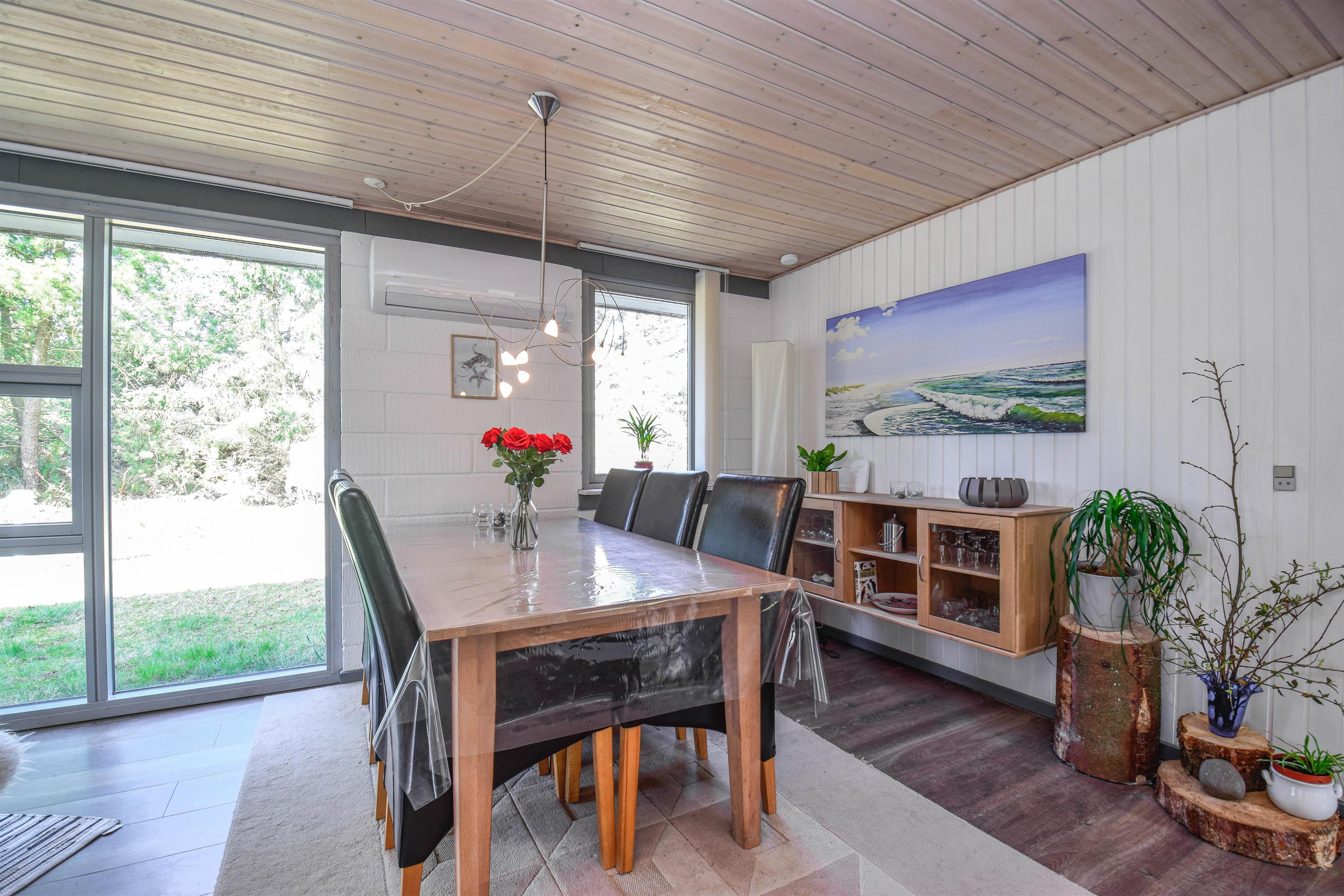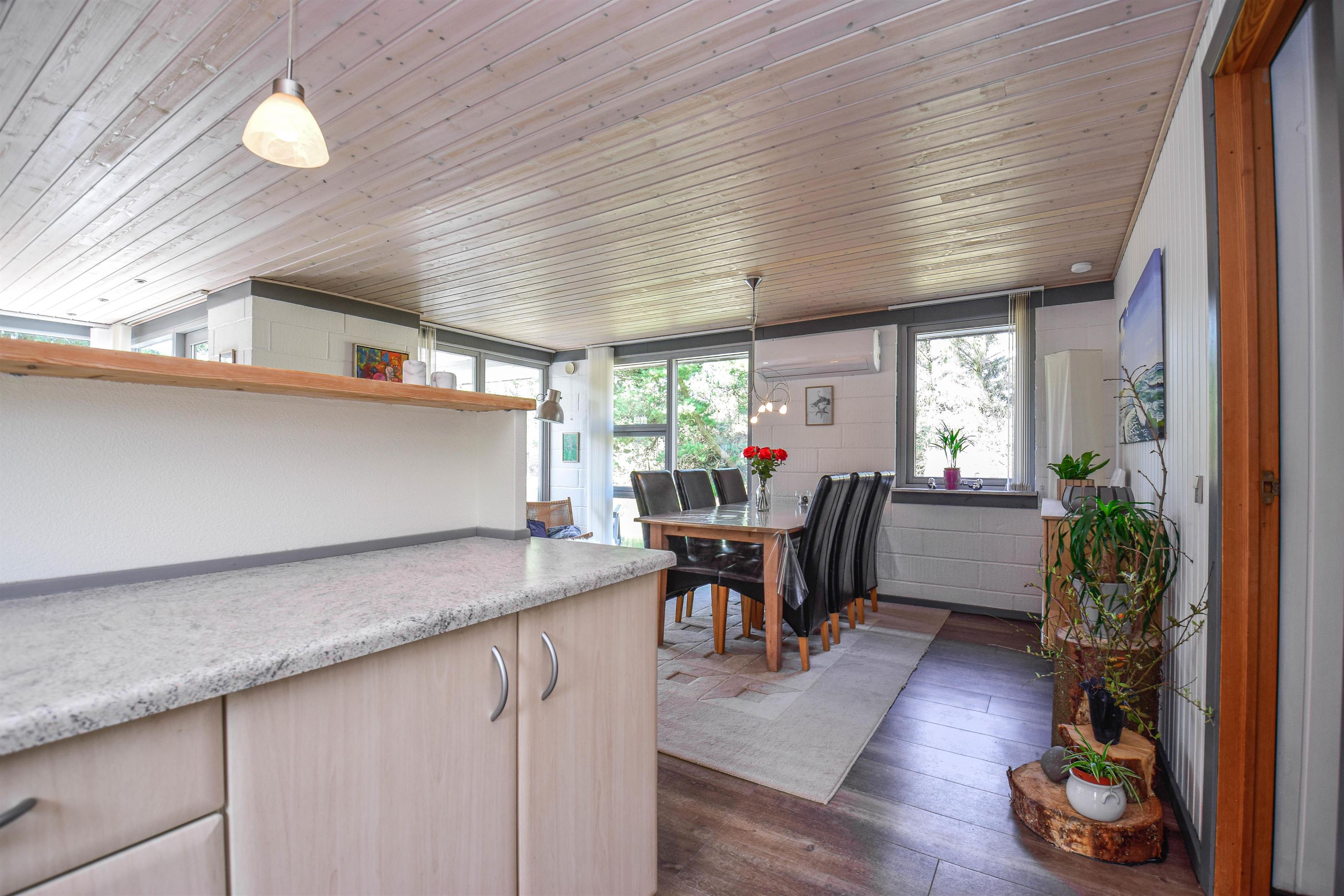 Husets hjerte er det store, åbne køkken-alrum med stue, hvor der er god plads til samvær. Her kan du slappe af i sofaen med en god bog eller tænde op i brændeovnen, mens maden simrer i køkkenet.
