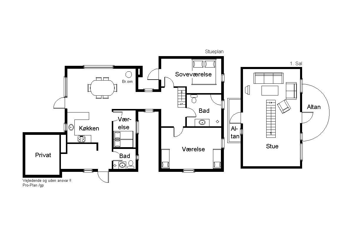 Indretning: God entre, dejligt lille badeværelse, et værelse med dobbeltseng, pænt køkken, stue med brændeovn og udgang til overdækket terrasse, værelse med 2 enkeltsenge samt stort soveværelse med dobbeltseng. Badeværelse med bruseniche. På 1. sal er der indrettet en flot lys stue, hvorfra der er en rigtig flot udsigt over Nissum Fjord med klitterne i baggrunden. Fra udsigtsstuen er der udgang til 2 gode altaner, hvorfra der er en dejlig udsigt over fjorden og området.