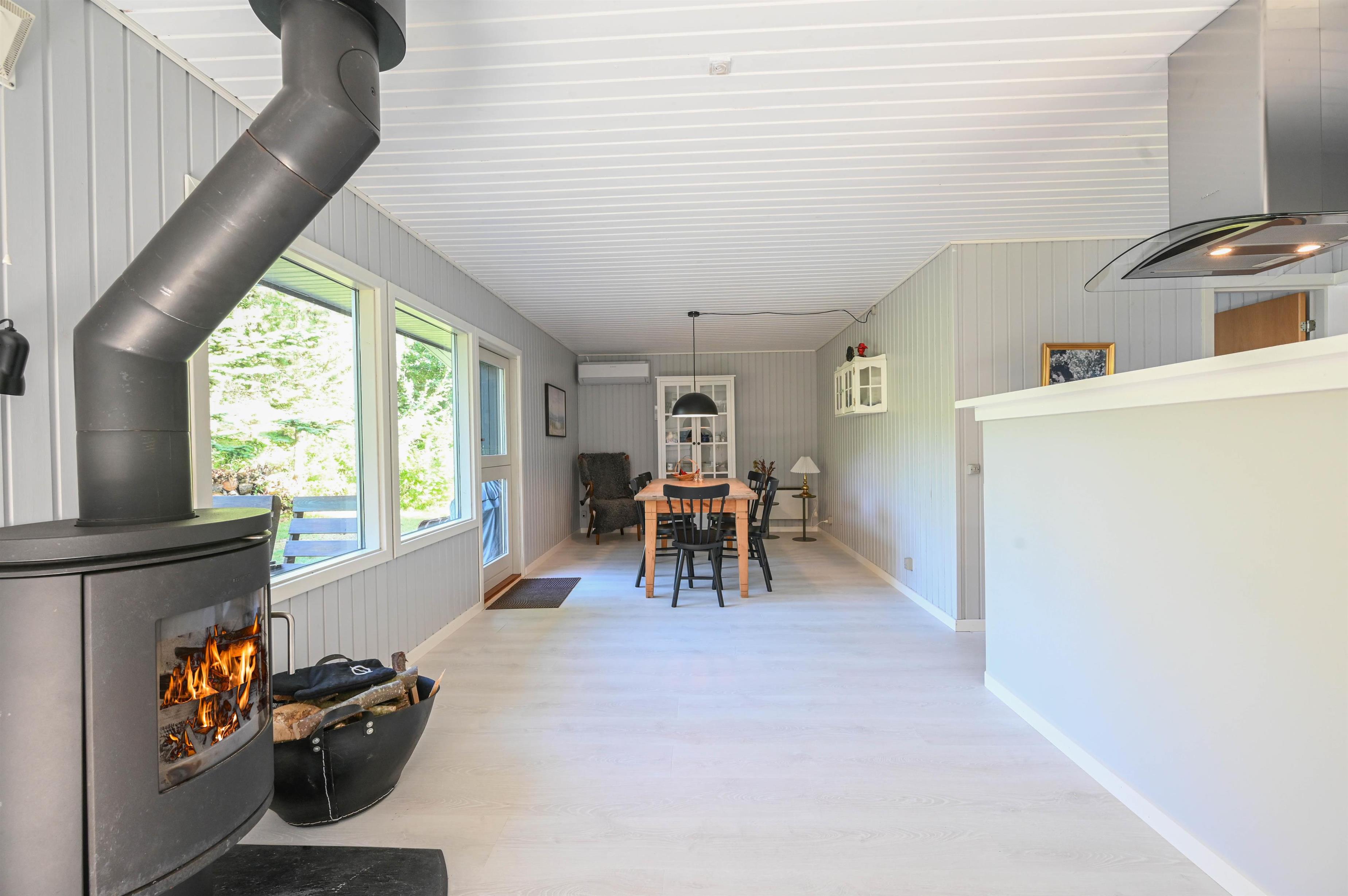 Stue med brændeovn, TV og udgang til overdækket terrasse