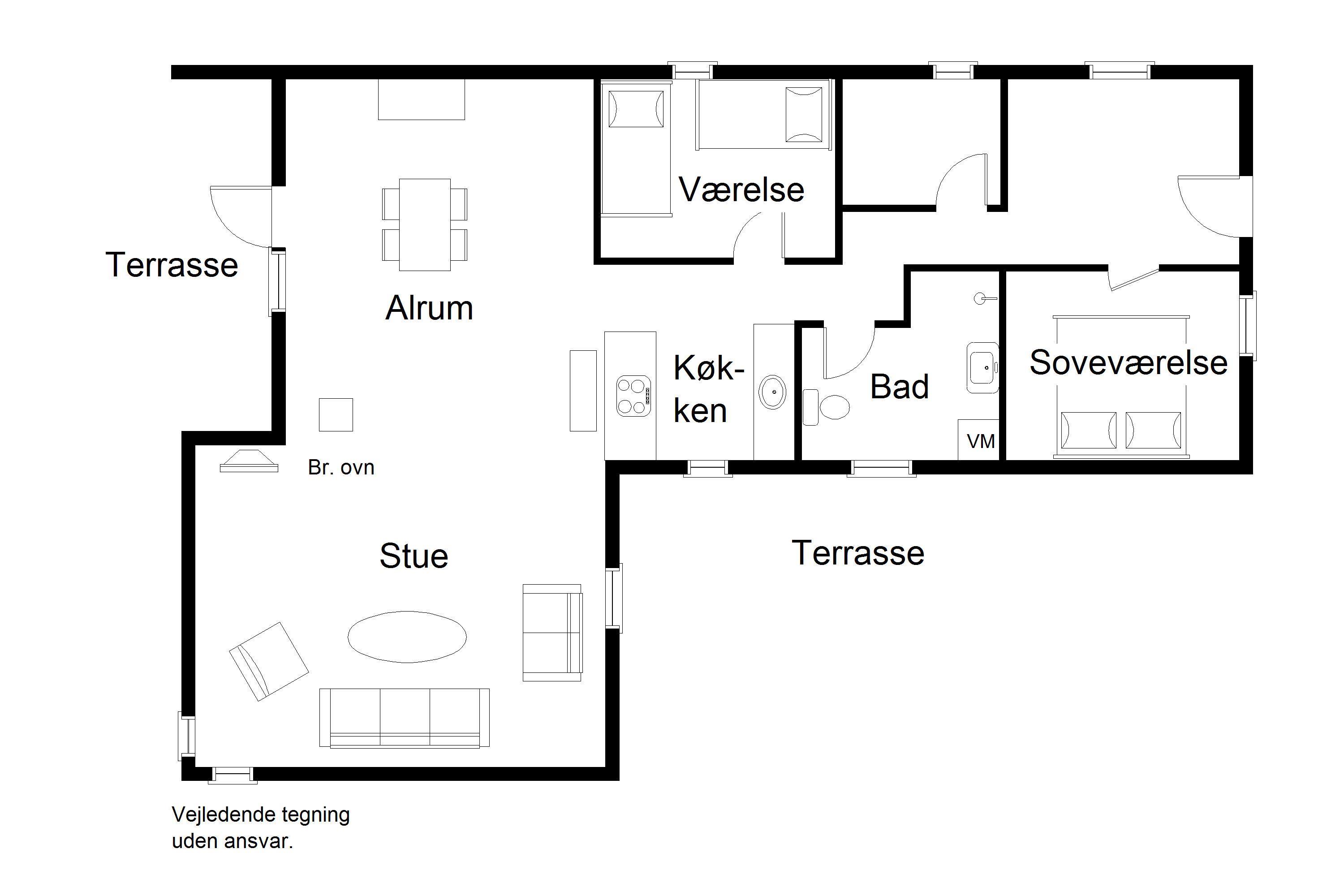 Feriehuset fremstår lyst og venligt med en praktisk indretning og god plads i de vigtigste rum. Det åbne køkken ligger i forbindelse med spiseplads og stue, hvor der er udgang til en lille overdækket terrasse – perfekt til en rolig kop kaffe eller en hyggelig stund i aftensolen.