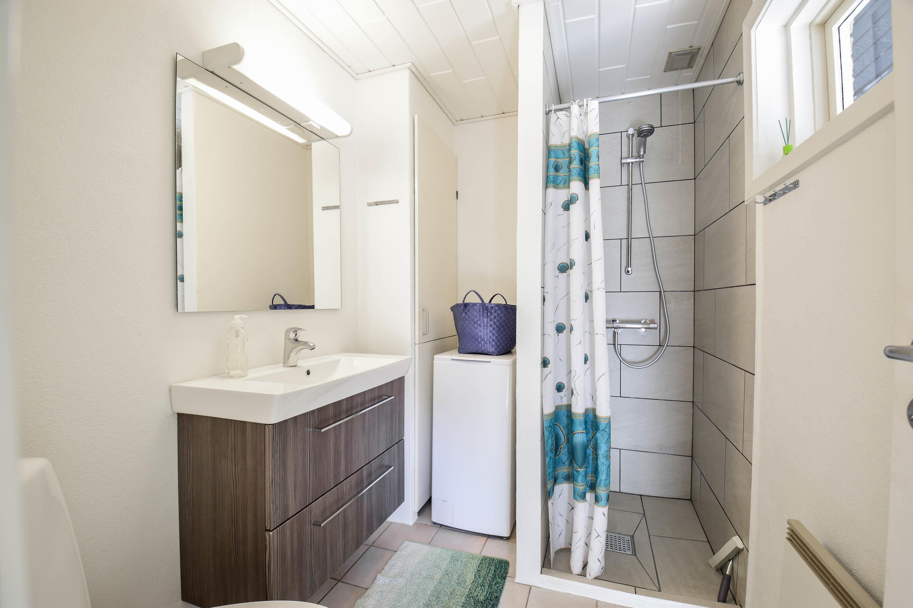 Badeværelse med bruseniche og topbetjent vaskemaskine