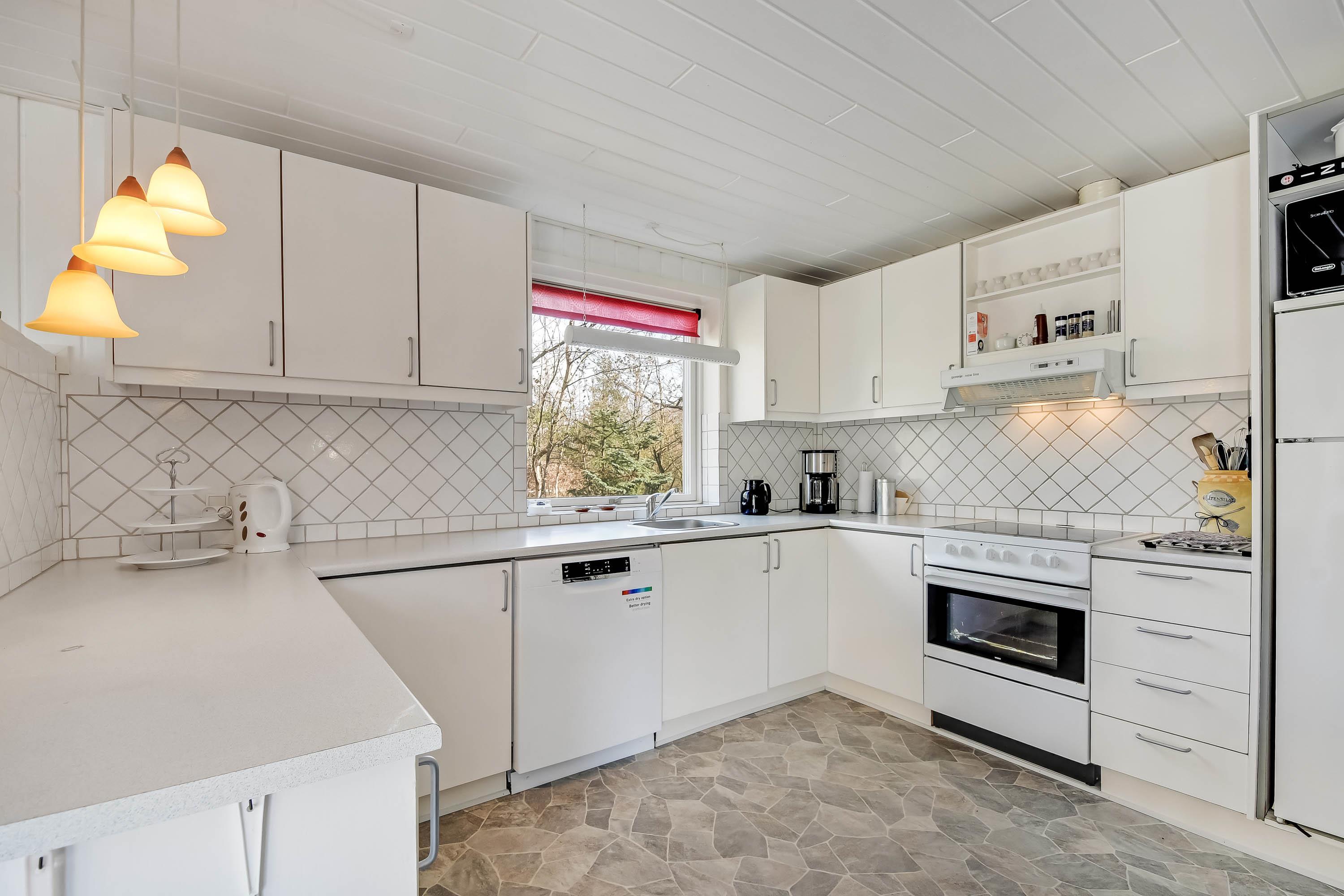 Køkkenet er veludstyret med god bordplads, mange skabe og opvaskemaskine. Det ligger i forbindelse med stuen, hvor brændeovnen er centralt placeret og skaber varme og stemning på de kølige dage. Fra stuen er der udgang til en dejlig terrasse med masser af læ – det perfekte sted til morgenkaffen, solbadning eller aftensmad i det fri.