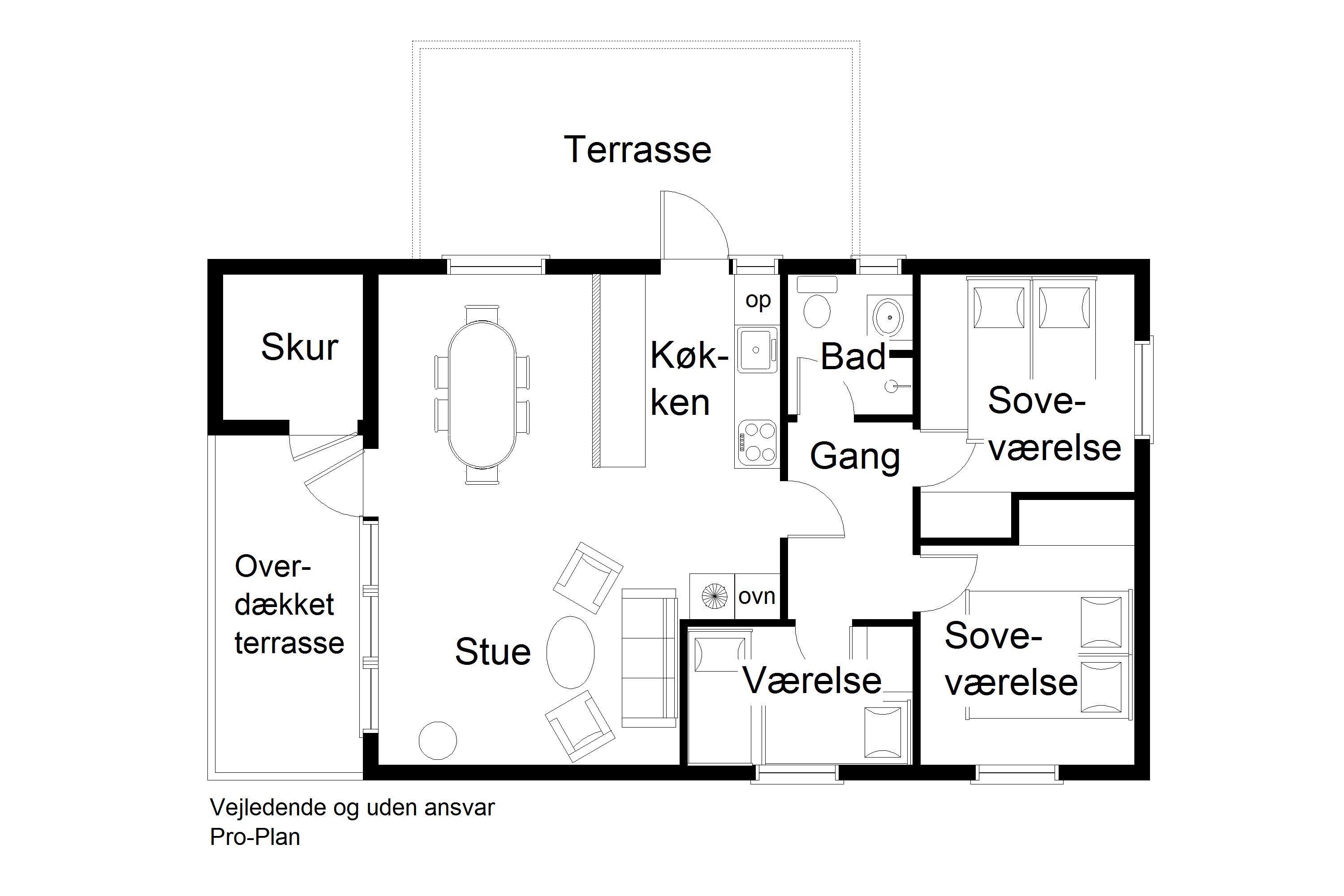 Stue med spiseplads, sofagruppe, TV og brændeovn