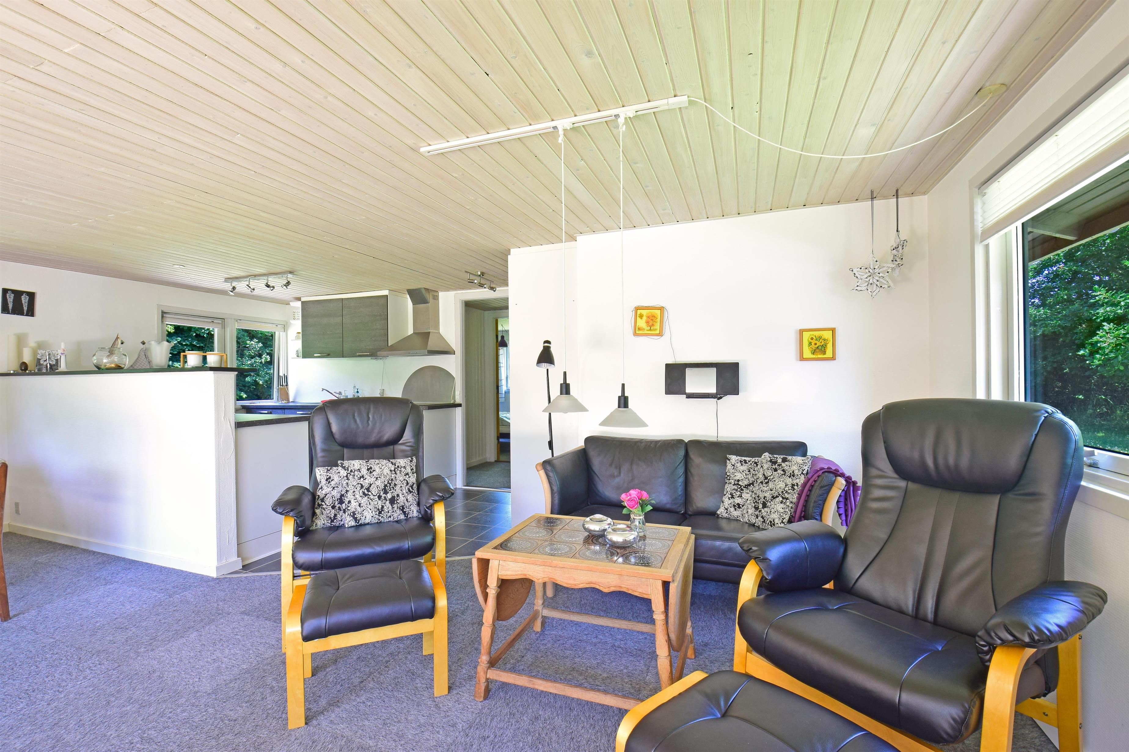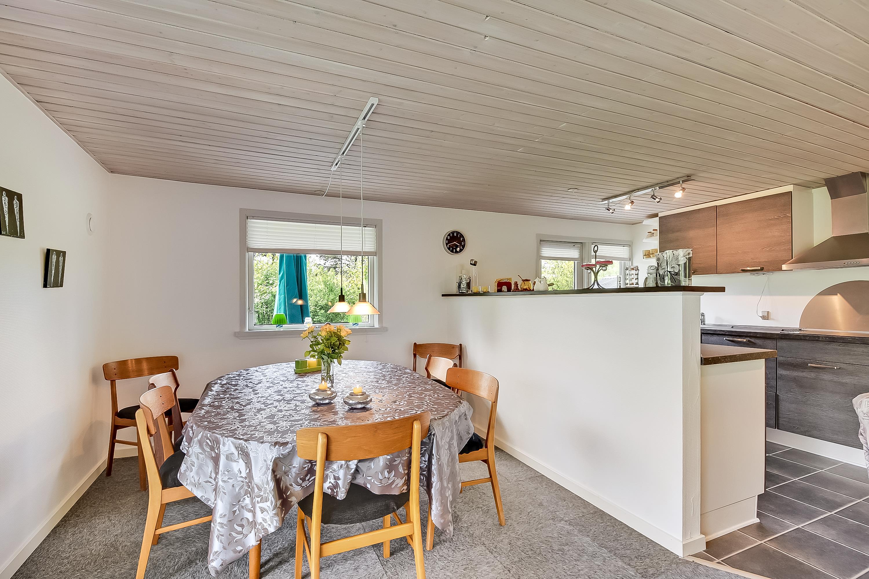 Feriehuset er indrettet med et nyere køkken og stue i ét, møbleret i en personlig og hyggelig stil, hvor man straks føler sig hjemme. Her kan I samles omkring brændeovnen efter en dag ved fjorden eller nyde måltiderne sammen i den lyse spiseplads. Fra stuen er der udgang til en sydvendt, overdækket terrasse – et skønt sted at sidde og nyde solen og de rolige omgivelser.