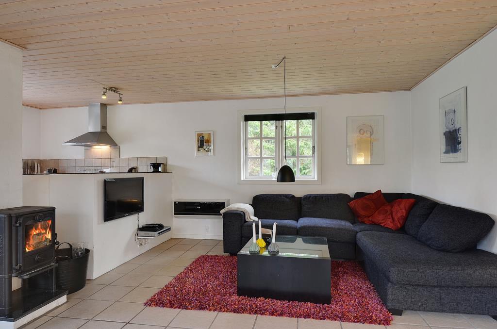 Det lyse køkken ligger i åben forbindelse med spiseplads og stue, hvor brændeovnen sørger for varme og stemning på kølige dage. Her er det let at samles om madlavning, spil og hyggelige aftener.