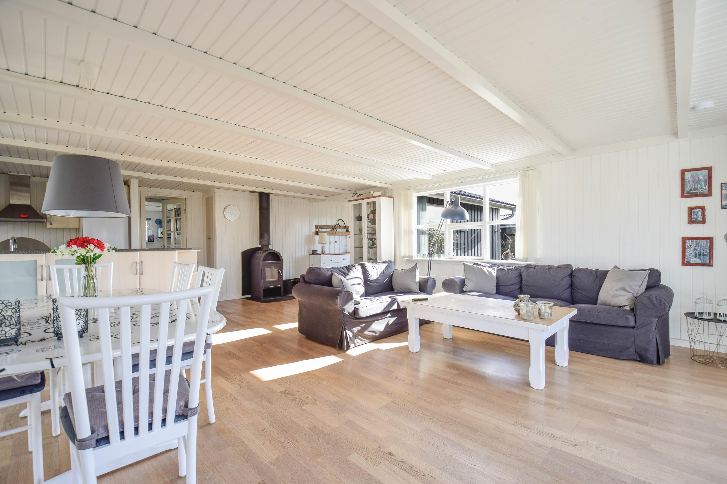 Huset er hyggeligt indrettet med bekvemme møbler og fine detaljer, og de store vinduespartier skaber et lyst og indbydende opholdsrum med udsigt til haven. Her er rammerne perfekte til både afslapning og samvær – uanset årstid.