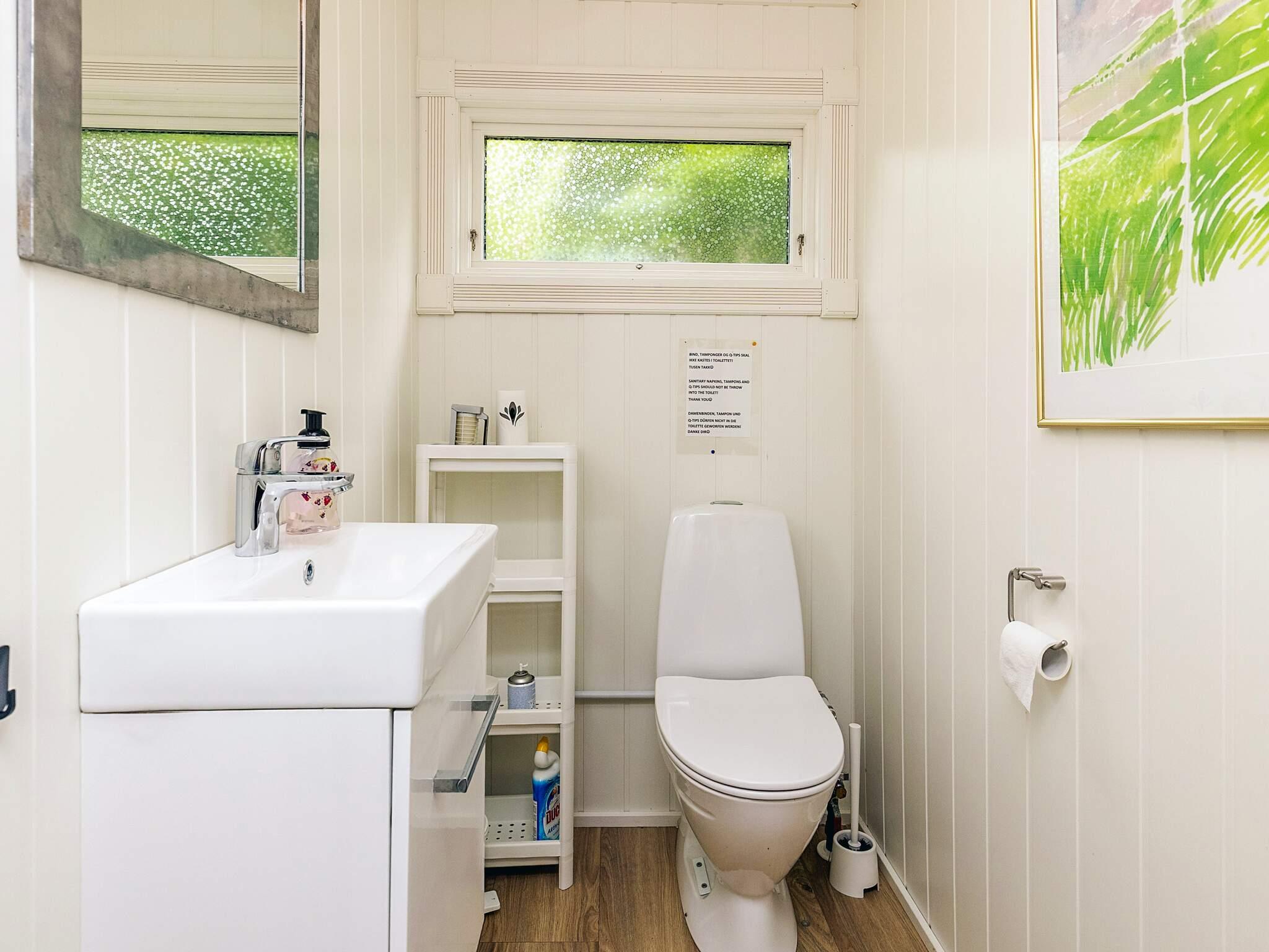 Toilettet er placeret i selve huset, og alt er designet med fokus på enkelthed, funktionalitet og komfort.