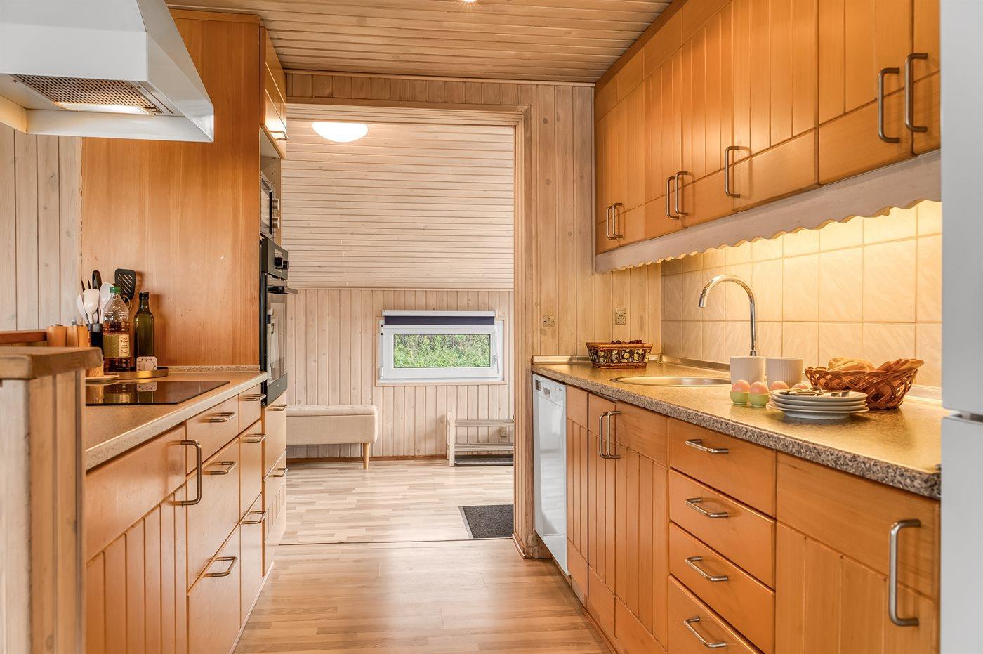 Køkkenet er udstyret med 1 køleskab. Der er 4 induktionskogeplader, varmluftovn, mikrobølgeovn samt opvaskemaskine.