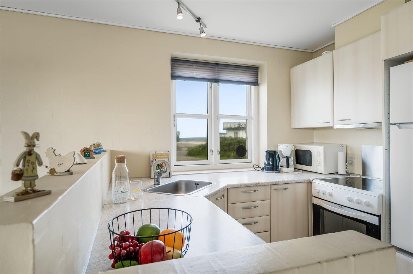 Køkkenet er udstyret med 1 køleskab. Der er 4 keramiske kogeplader, varmluftovn, mikrobølgeovn samt opvaskemaskine Der er gulvvarme i køkkenet.
