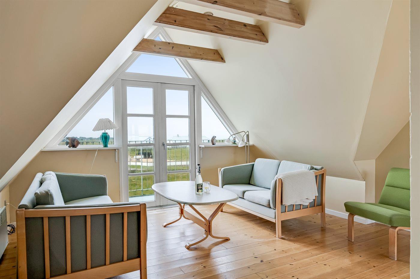 Et arkitekttegnet feriehus i 2 plan med havudsigt fra stuen og køkkenet. På. 1. sal er der udgang til en lille balkon med panoramahavudsigt.