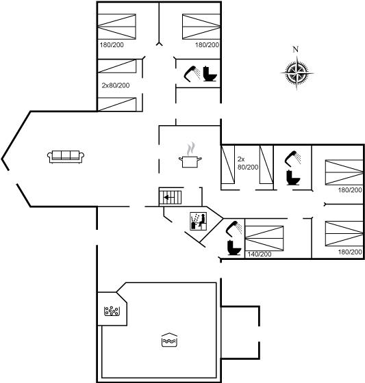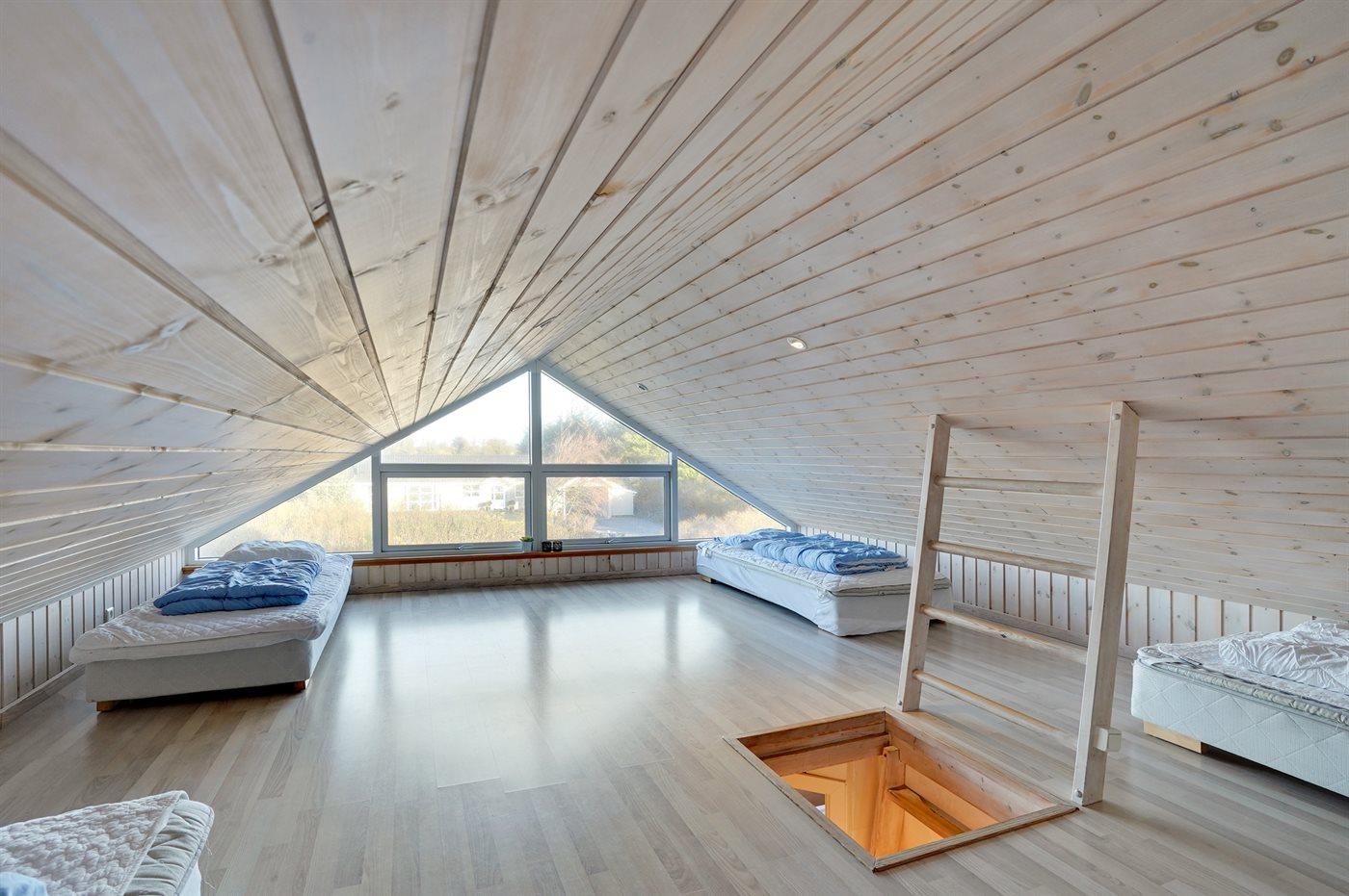 Der er i alt 7 soveværelser. Sovepladserne fordeler sig på: 10 sovepladser i dobbeltsenge. 4 sovepladser i enkeltsenge. 6 sovepladser på madrasser. 6 af disse sovepladser fordeler sig på 2 hemse. Derudover er der 1 stk. barneseng.