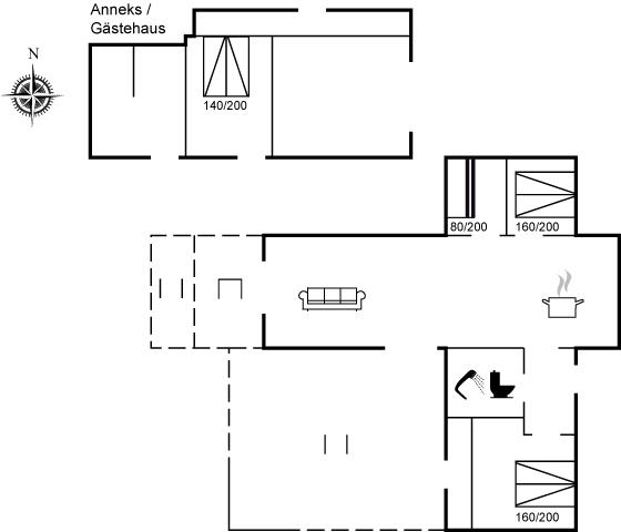 Der er i alt 4 soveværelser. Sovepladserne fordeler sig på: 6 sovepladser i dobbeltsenge.1 soveplads i køjeseng. 2 af disse sovepladser befinder sig i anneks.