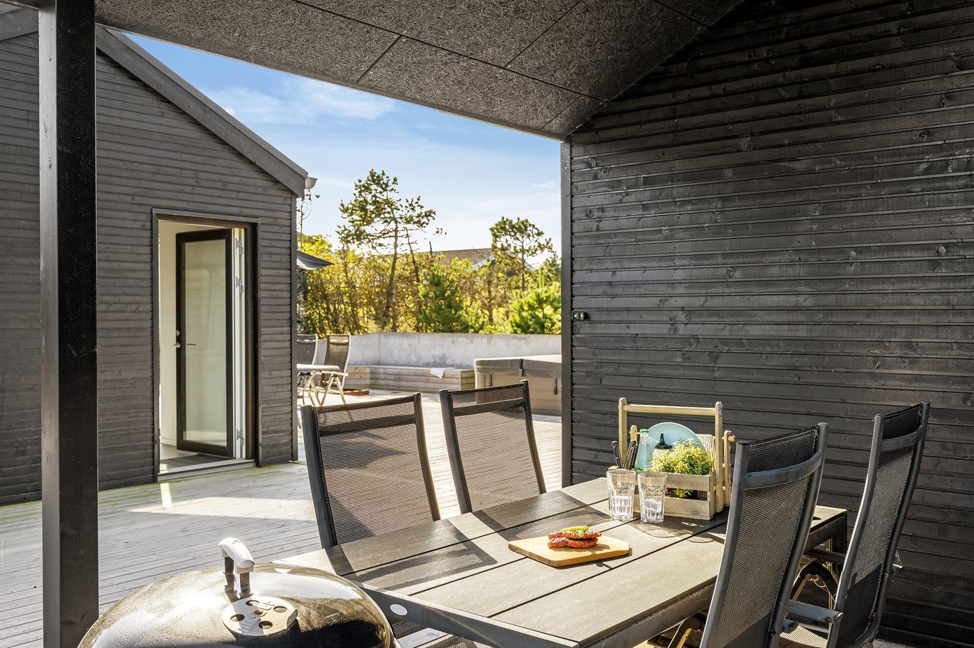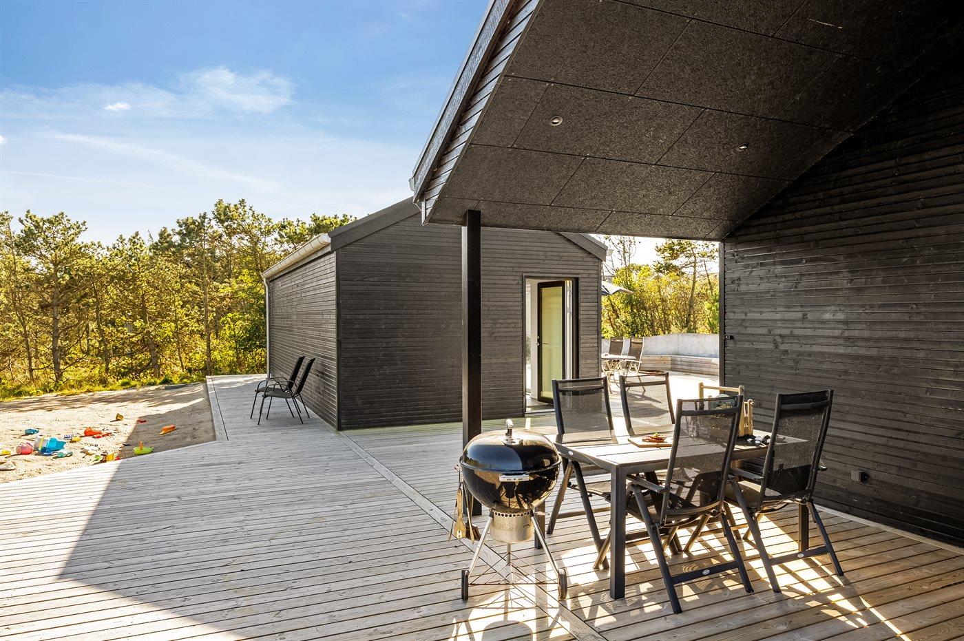 Ferieboligen er beliggende på en 1048 m² stor havegrund. Grunden er indhegnet. Der er 400 m til havet. Nærmeste forretning er beliggende i en afstand af 4000 m. Til ferieboligen hører åbent terrasseareal. Desuden er der overdækket terrasse. Sandkasse. Bålsted. Udendørs sauna. Udendørs bruser. Grill til rådighed. Parkering ved ferieboligen.