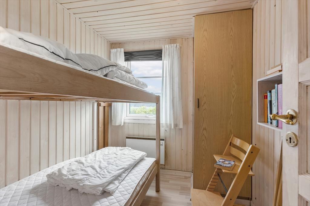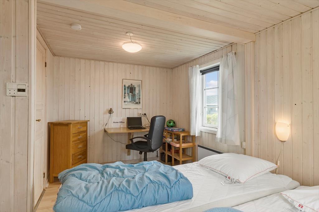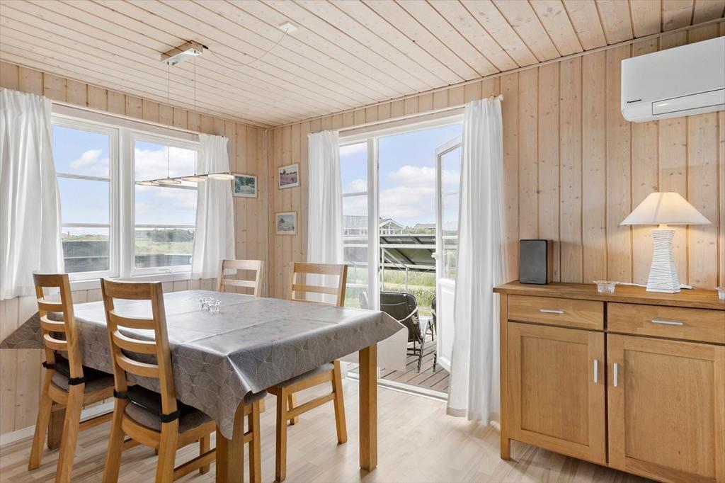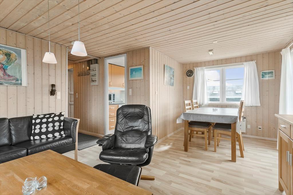 Indenfor byder sommerhuset på en dejlig og varm atmosfære. Det kombinerede køkken og opholdsrum gør det let at samles som familie, mens du tilbereder et måltid og nyder hinandens selskab. Fra spisebordet er der et lille kig til Vesterhavet, så du kan følge med i havets gang, mens du hygger dig inden døre. De tre soveværelser giver plads til en god nats søvn, og badeværelset, som har gulvvarme, indbyder til varme og komfort efter en lang dag på stranden. Sommerhuset er indrettet med omtanke for både funktion og hygge, og den klassiske stil skaber en dejlig ro i hjemmet.
