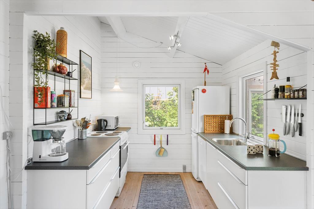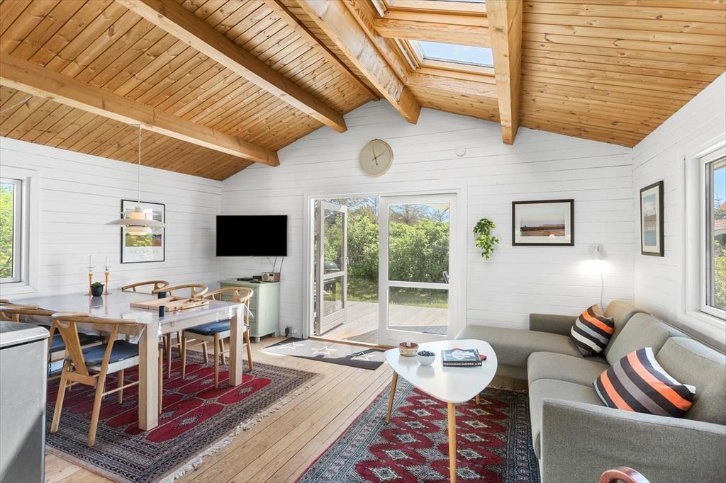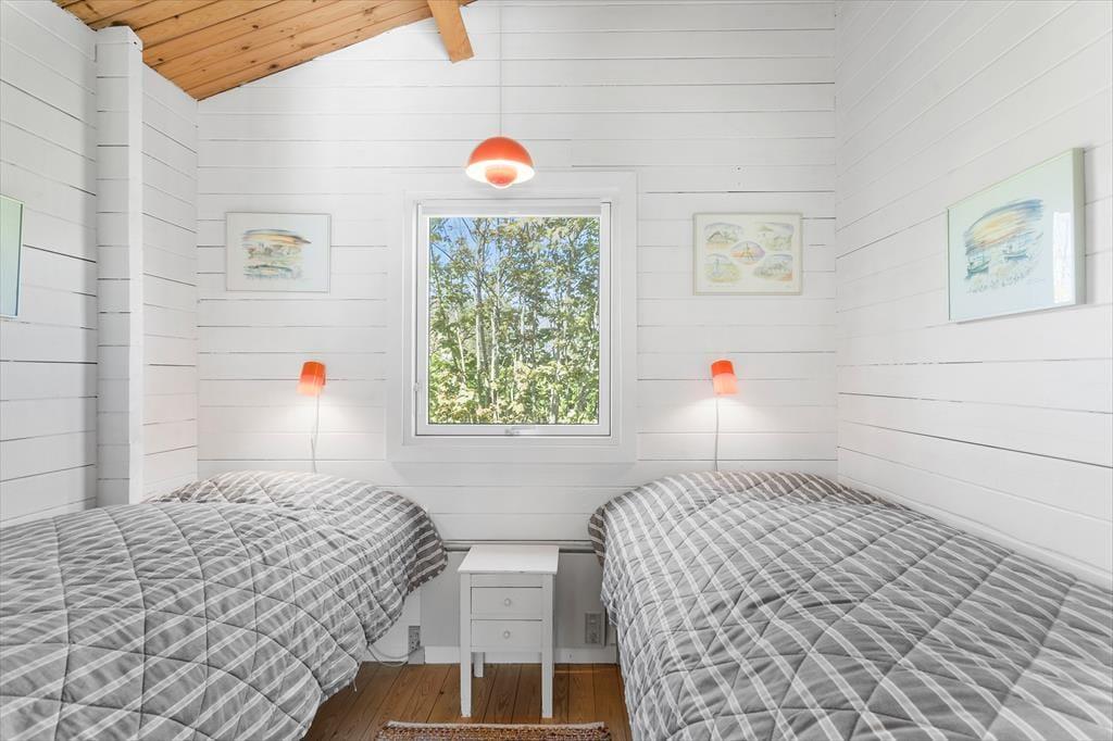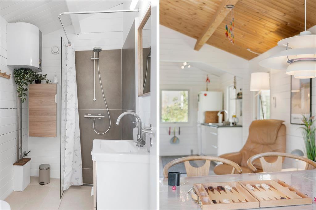 Man kommer nærmest automatisk i feriestemning, når man ankommer til den grønne sommerhusgrund og ser det hyggelige træhus. Inden døre er atmosfæren varm og indbydende – præcis som det skal være i et rigtigt sommerhus. I stuen er der rustikke trælister på væggene, loft til kip og brændeovn, og ovenlysvinduerne er med til at give et ekstra godt lysindfald. Et velindrettet køkken ligger i åben forbindelse med stuen, og her er der både vaskemaskine og opvaskemaskine plus gode arbejdsforhold, når der skal laves mad. Et nyere badeværelse med bruser og gulvvarme rummer sommerhuset også foruden to soveværelser med sengepladser til i alt fire personer. I har mulighed for at forlænge sommeren i den skønne udestue mod øst.