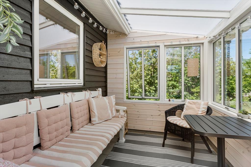 Når solen står højt på himmelen, er det måske ikke indendørs hygge ved brændeovnen, der trækker. I stedet er det skønt at kunne slå sig ned på sommerhusets delvist overdækkede træterrasse, der er orienteret mod syd og vest. Fra husets terrasse i grundens nordvestlige hjørne, kan I få et havkig. I kan altså nyde solnedgangen med kig til havet på solnedgangsterrassen i grundens vestlige del. Mod øst ligger der også en lille skøn terrasse med bord-bænkesæt, hvor morgenkaffen kan nydes i solen. Så uanset tidspunktet på dagen er det muligt at finde en siddeplads i en solstråle på den ugenerede, grønne grund. På grunden finder I også et hyggeligt bålsted og hængekøje i lækrogen.