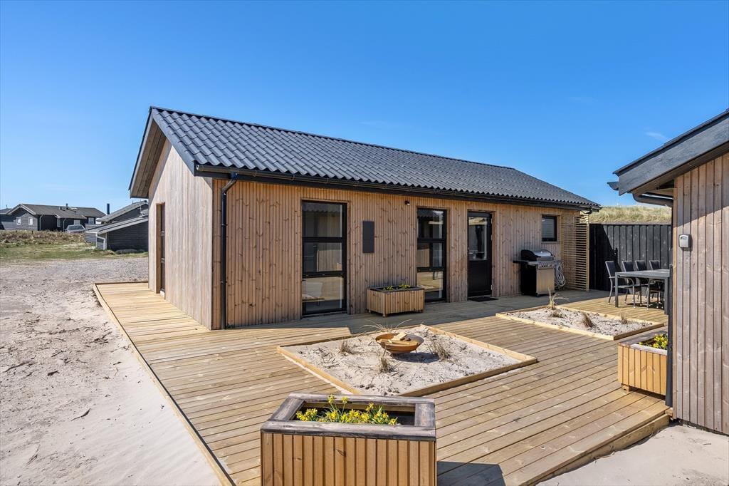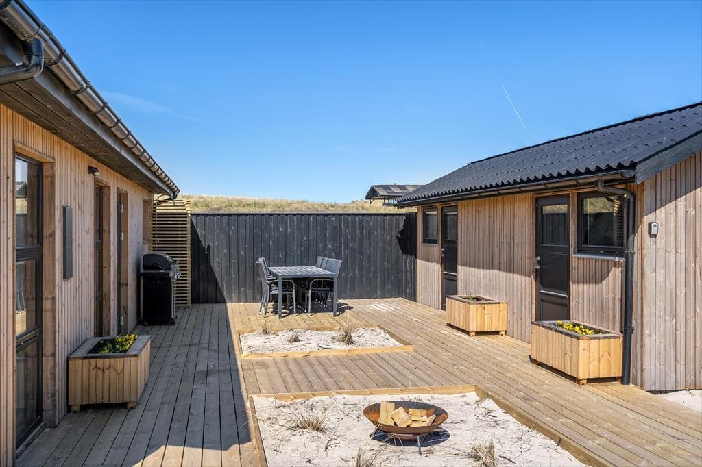 Mellem sommerhuset og annekset ligger en smuk træterrasse. Den får læ fra et plankeværk mod nordvest, og der er gode chancer for at finde en ugeneret opholdsplads i solen. Har I ikke lyst til at rykke indenfor, når aftenen nærmer sig, kan I tænde grillen og eventuelt finde en sweater frem, mens den nedadgående sol begynder at farve omgivelserne i varmere farvetoner.