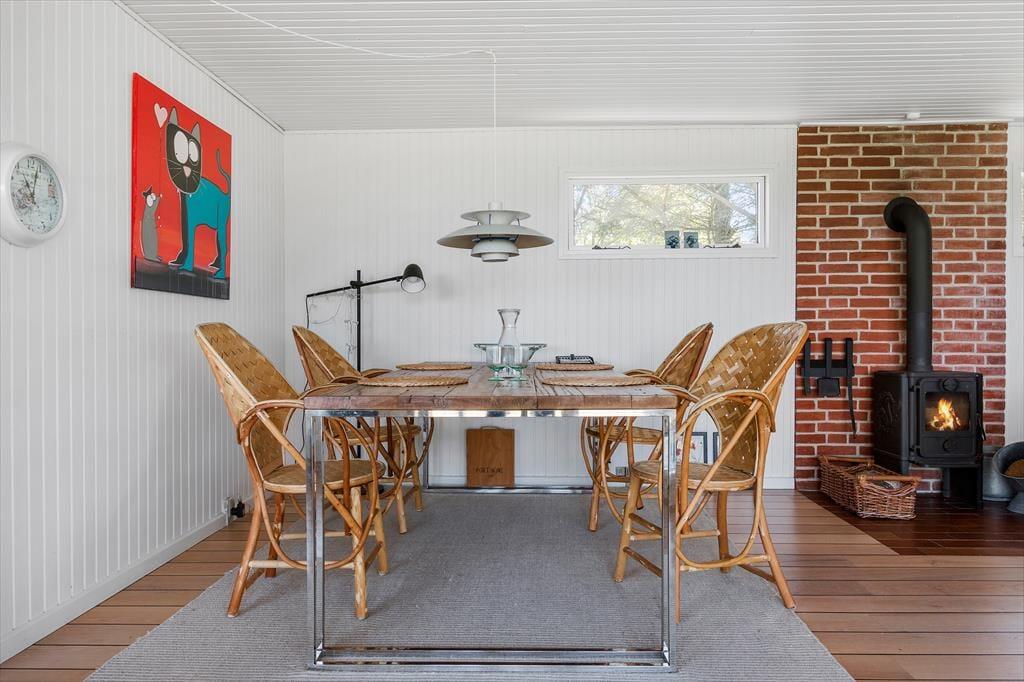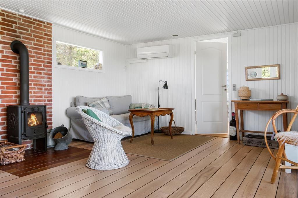 Fra husets terrasse træder I ind i huset hjerterum som byder på en stor og rummelig stue. I stuen finder i en brændeovn, som kan bidrage med varme og hyggeligt samvær. Huset køkken er charmerende og rummeligt. Derudover byder dette skønne sommerhus på 3 værelser og et badeværelse.