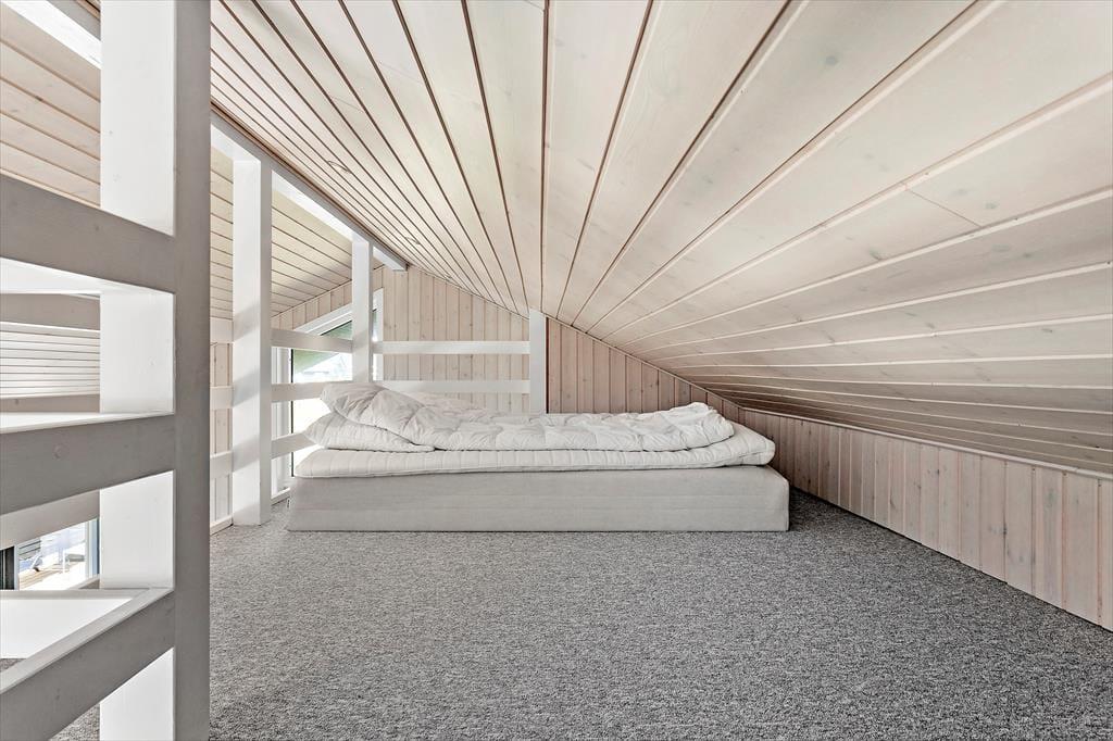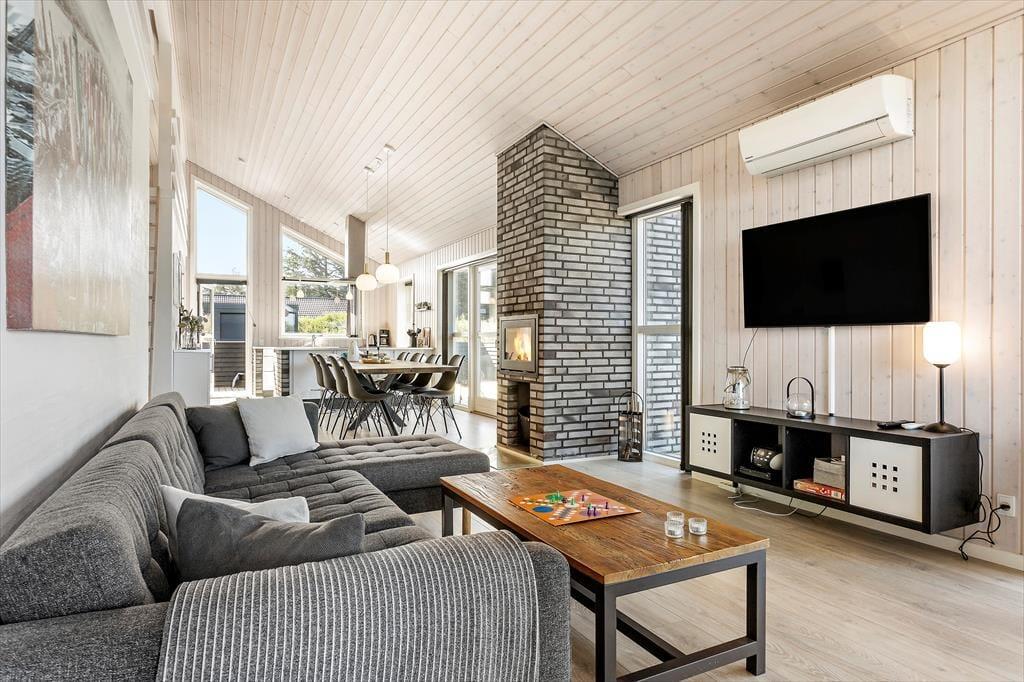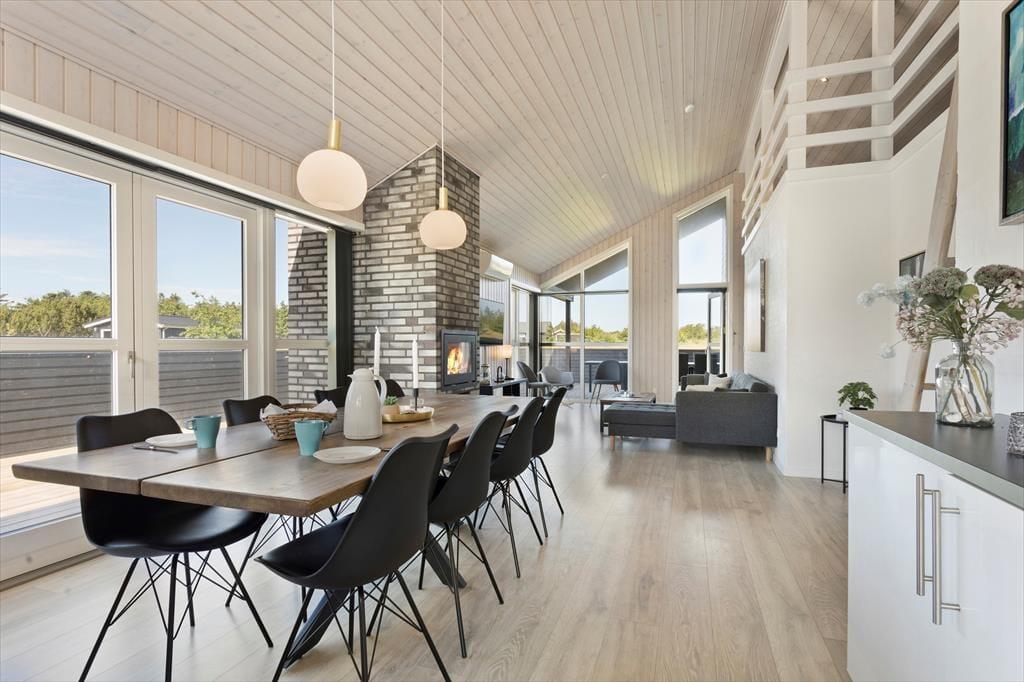 Træd ind i dette moderne sommerhus, der er opført i kvalitetsmaterialer og indrettet med tanke på både komfort og hygge. Sommerhuset har tre rummelige værelser, to badeværelser og en hyggelig hems, som børnene vil elske at opholde sig på. Det største badeværelse er udstyret med både spa og sauna, så du kan forkæle dig selv med lidt ekstra wellness i løbet af ferien. I den lyse opholdsstue kan du samles med familien foran brændeovnen, mens de store vinduer lukker masser af naturligt lys ind og giver en fantastisk udsigt til de omkringliggende naturskønne omgivelser. Køkkenet er åbent og veludstyret, hvilket gør det nemt at tilberede lækre måltider med lokale råvarer, mens du stadig kan være en del af fællesskabet i stuen.