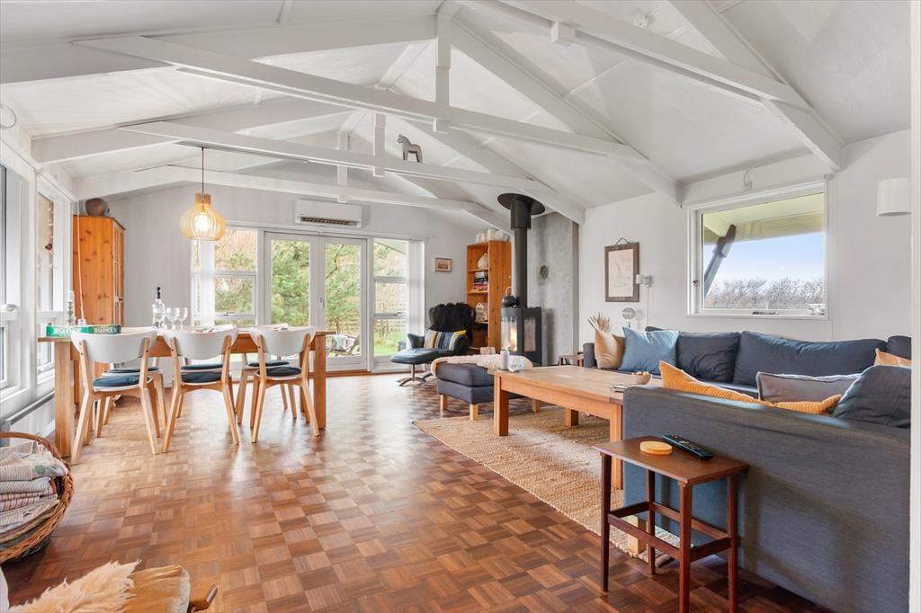 Sommerhuset byder på en lys og indbydende atmosfære med en rummelig stue, hvor hele familien kan samles. De store vinduer sikrer et fantastisk lysindfald, så du kan nyde solen hele dagen. Stuen er møbleret med komfortable møbler og giver plads til både afslapning og hyggelige stunder. I det lækre, åbne køkken kan du tilberede måltider med de bedste lokale råvarer, mens du stadig er en del af samtalerne i stuen. Sommerhuset har tre gode soveværelser, der giver masser af plads til hele familien. Det tilhørende badeværelse er pænt og funktionelt, og her kan du tage et afslappende bad efter en dag ude i naturen.