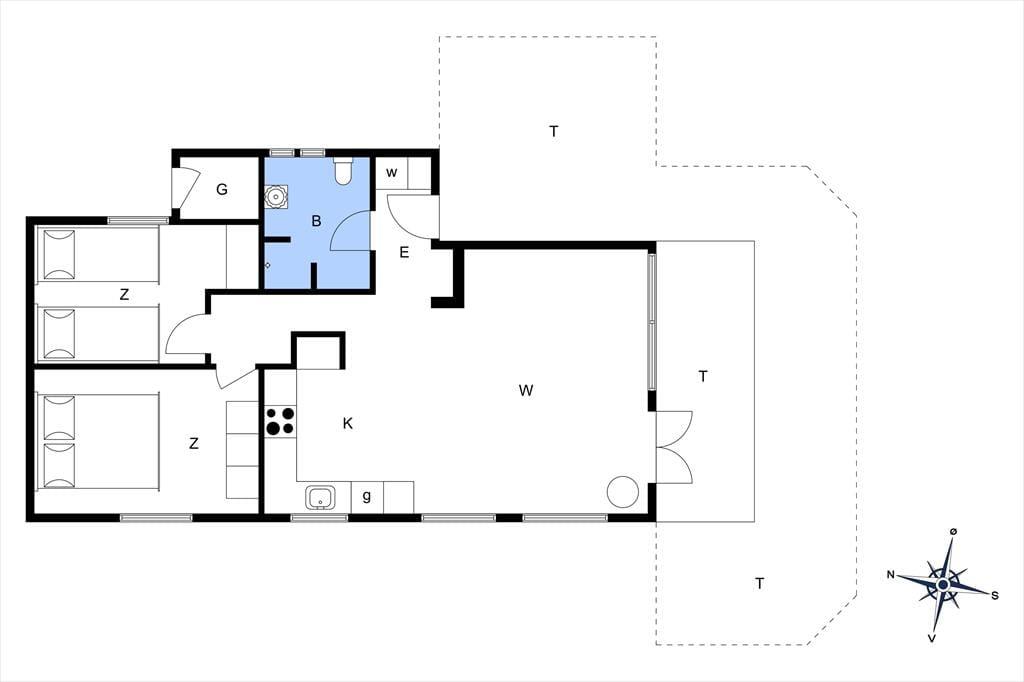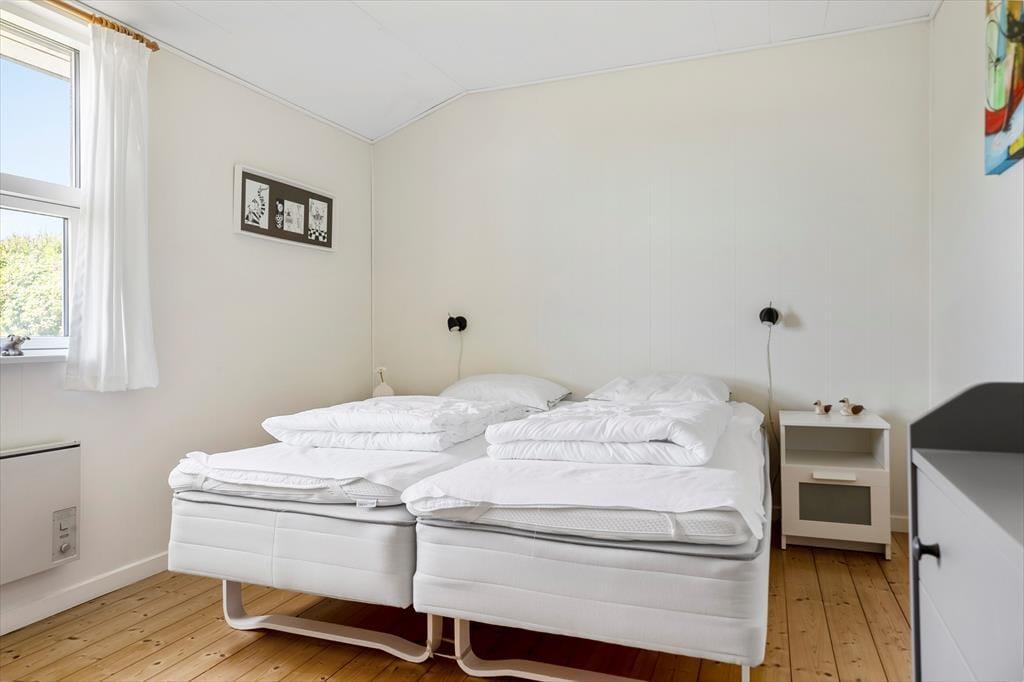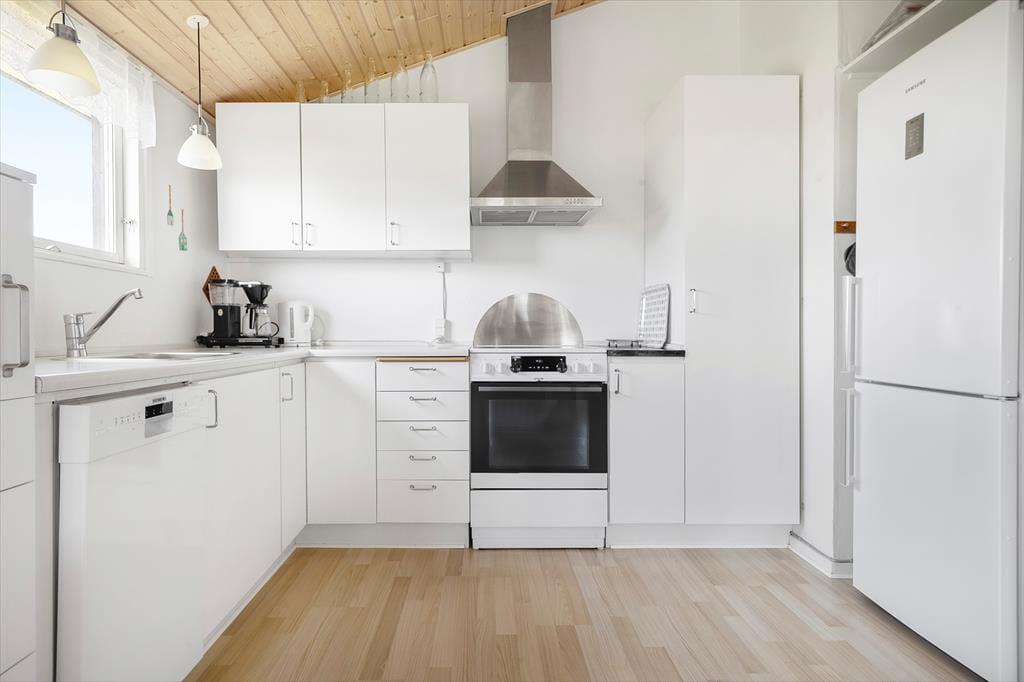 Indenfor i sommerhuset bliver du mødt af en lys og venlig atmosfære, hvor den hyggelige indretning giver en helt særlig ro. Her er det let at finde sig til rette med en god bog i sofaen eller en kop kaffe ved spisebordet, mens solen strømmer ind gennem vinduerne. Stuen og køkkenet er forenet i et åbent opholdsrum, hvor brændeovnen står klar til at varme rummet op på kølige aftener – med knitrende flammer og feriestemning i luften. Her er det nemt at forestille sig, hvordan samtalen flyder frit over aftensmaden, mens lyset udenfor langsomt dæmpes og giver plads til aftenhygge med spil, grin og nærvær. De rolige omgivelser og den enkle indretning gør det nemt at komme helt ned i gear og nyde pausen fra hverdagen.