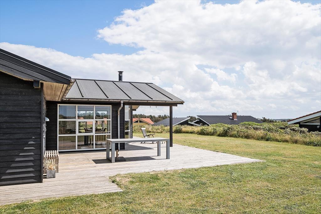 Sommerhuset er omgivet af en stor, sammenhængende terrasse, der giver de bedste muligheder for at nyde sommerens sol og varme, grill og gode havemøbler er til rådighed. Har man været i Vesterhavets bølger kan man vaske sand og salt af sig under den udendørs bruser og på græsplænen er der masser af plads til boldspil og leg for hele familien.