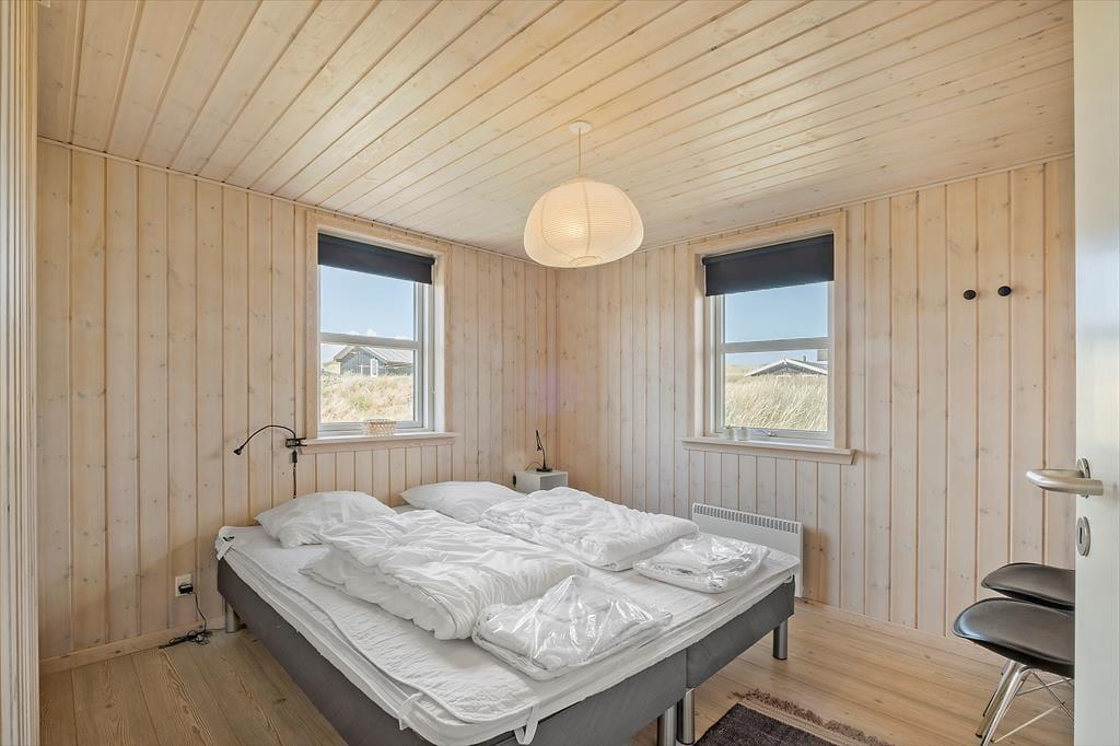 Sommerhuset er moderne og rummeligt, så er man to familier, eller vil man gerne have et bedsteforældrepar med på ferie, er der gode muligheder for dette. De otte sengepladser er fordelt på tre værelser med dobbeltsenge og en hems med to madrasser -her kan børnene også lege og hygge sig uden forstyrrelser. Det store og åbne køkken-opholdsrum har store vinduespartier, som lukker dejligt med lys ind og giver en skøn udsigt til Nr. Lyngbys smukke natur. Desuden to badeværelser, hvoraf det ene er med spabad, sauna, vaskemaskine og tørretumbler. Den ekstra store brændeovn er god at varme sig ved om efteråret efter en lang gåtur ved vandet eller på de kølige morgener, og om sommeren kan man lukke op til den store terrasse og tage sin mad med udenfor. Et skønt og fuldt udstyret sommerhus med en hyggelig atmosfære, som vil danne gode rammer om enhver ferie.