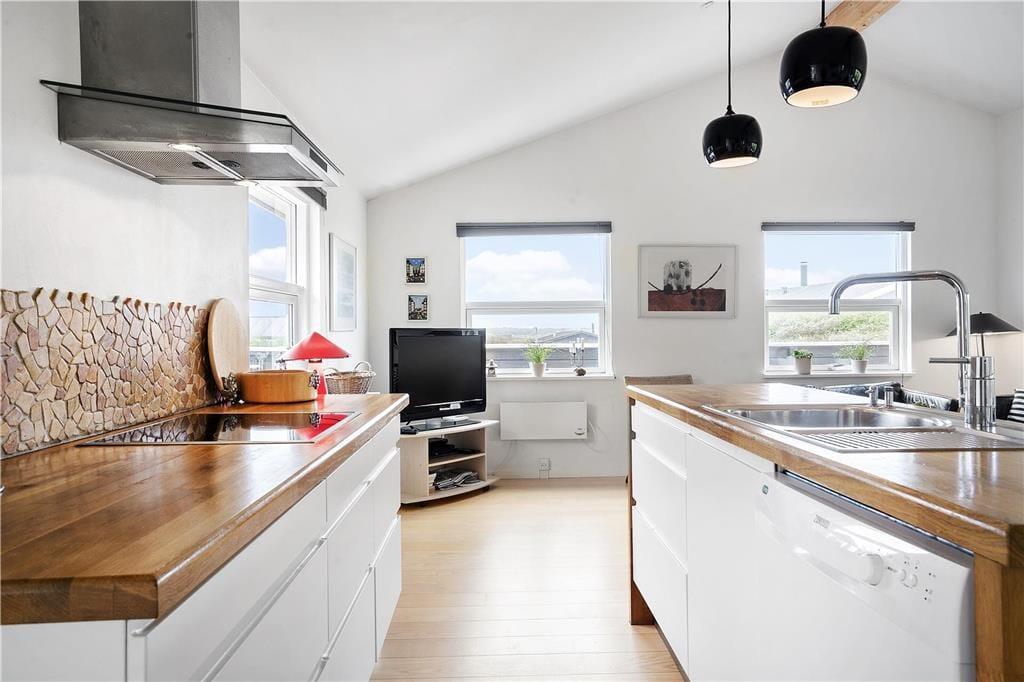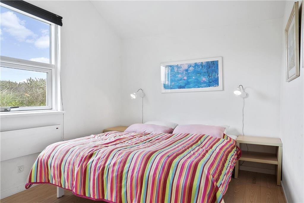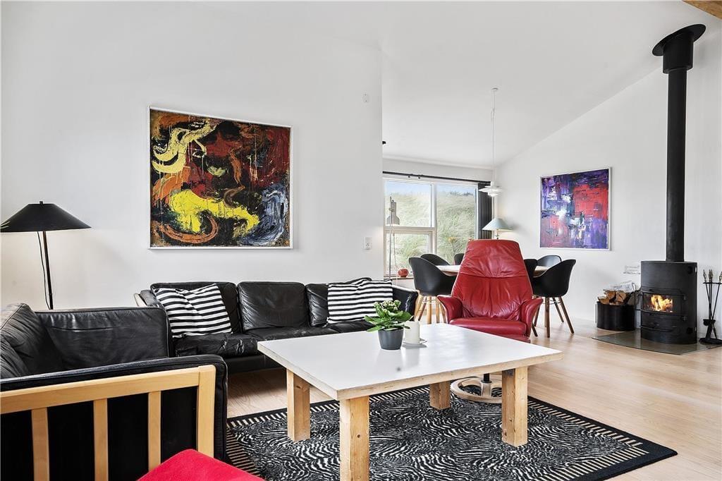 Sommerhuset er dejligt og funktionelt indrettet med værelser og badeværelser fordelt på en måde, så to familier sagtens kan være i sommerhuset sammen og alligevel have lidt privatliv. Det store opholdsrum med åbent køkken, spiseplads og stue ligger centralt og bliver hurtigt det naturlige samlingspunkt. Sommerhuset er lyst og moderne indrettet og specielt skal fremhæves de to dejlige badeværelser, hvoraf det ene er udstyret med et spabad. Fra husets atrium og de store terrasser kan solen nydes hele dagen. Huset opvarmes med klimaanlæg og brændeovn, hvilket sikrer et behageligt indeklima, samtidig med at energiomkostningerne er beskedne.