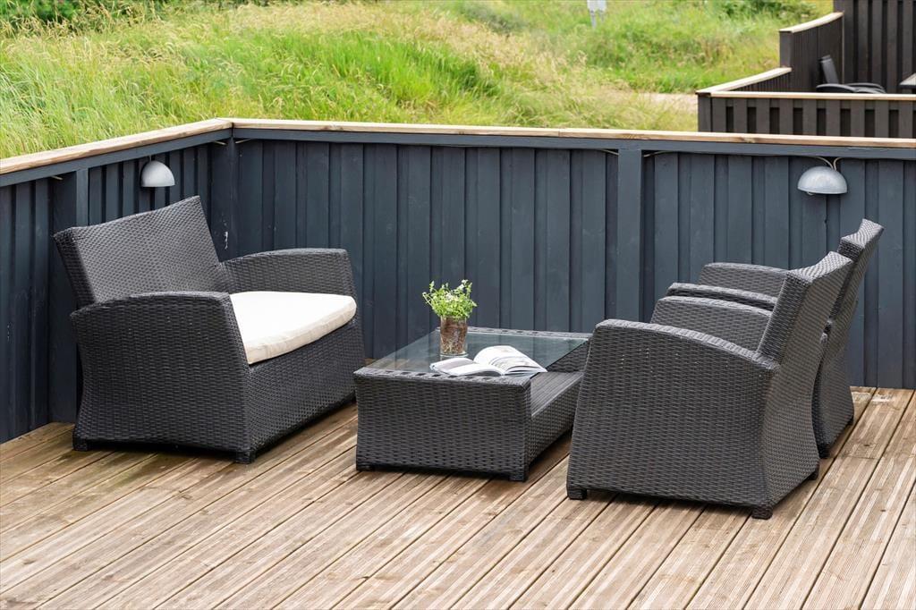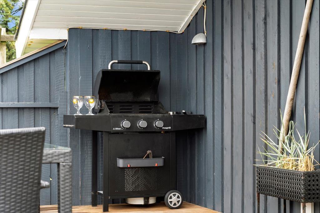 Når vejret er godt, kan en stor del af ferien udspille sig på husets store terrassemiljø. Det måler hele 150 m2 og breder sig mod både øst, syd og vest, så I får nemt ved at finde en opholdsplads i solen. Terrassen er helt lukket af med hegn, så børn og hunde kan lege i trygge rammer, og de lækre havemøbler sørger for, at I kan sidde komfortabelt. Et skur i forbindelse med huset gør det muligt at opbevare cykler og lignende i tørvejr, og der er både fiskerenseplads og udendørs bruser på grunden.