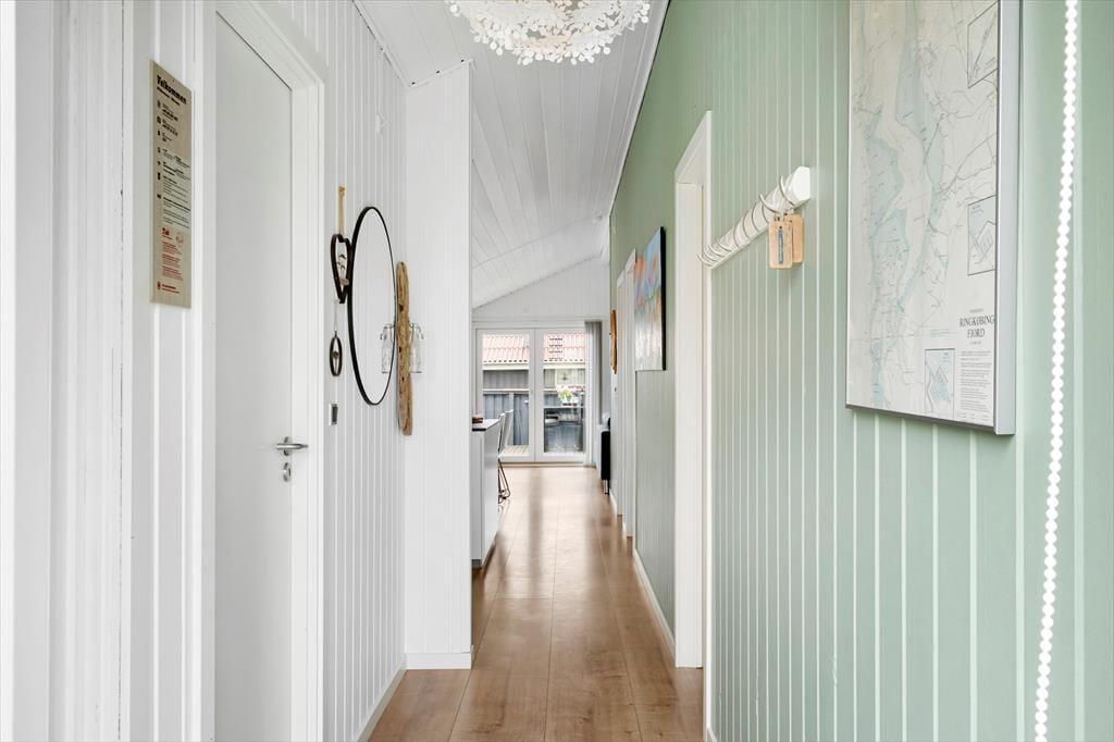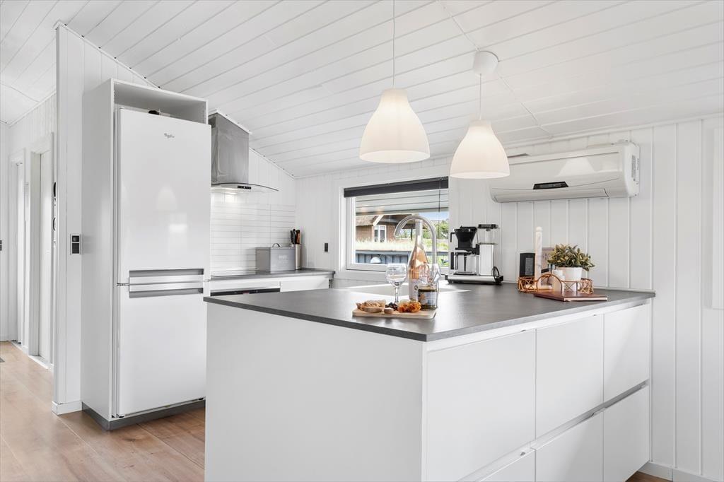 På den 1250 m2 store grund præsenterer sommerhuset sig på pæn og velordnet vis med sortmalet træfacade og hvide vinduesrammer. Inden døre får I også en tjekket ramme om ferielivet, for huset er løbende renoveret – senest i 2017, hvilket fremgår af de moderne indrettede rum. Køkkenet er udstyret med opvaskemaskine og andre gode hvidevarer, og den åbne forbindelse med stuen gør det nemt at inkludere madlavningen i feriehyggen. I køligt vejr kan I tænde for brændeovnen, og hvis der virkelig skal slappes af, kan I finde snacks frem og sætte jer godt til rette i sofaen med en sjov film på fladskærmen. Det velholdte sommerhus byder desuden på tre gode soveværelser og et badeværelse med bruser og vaskemaskine.