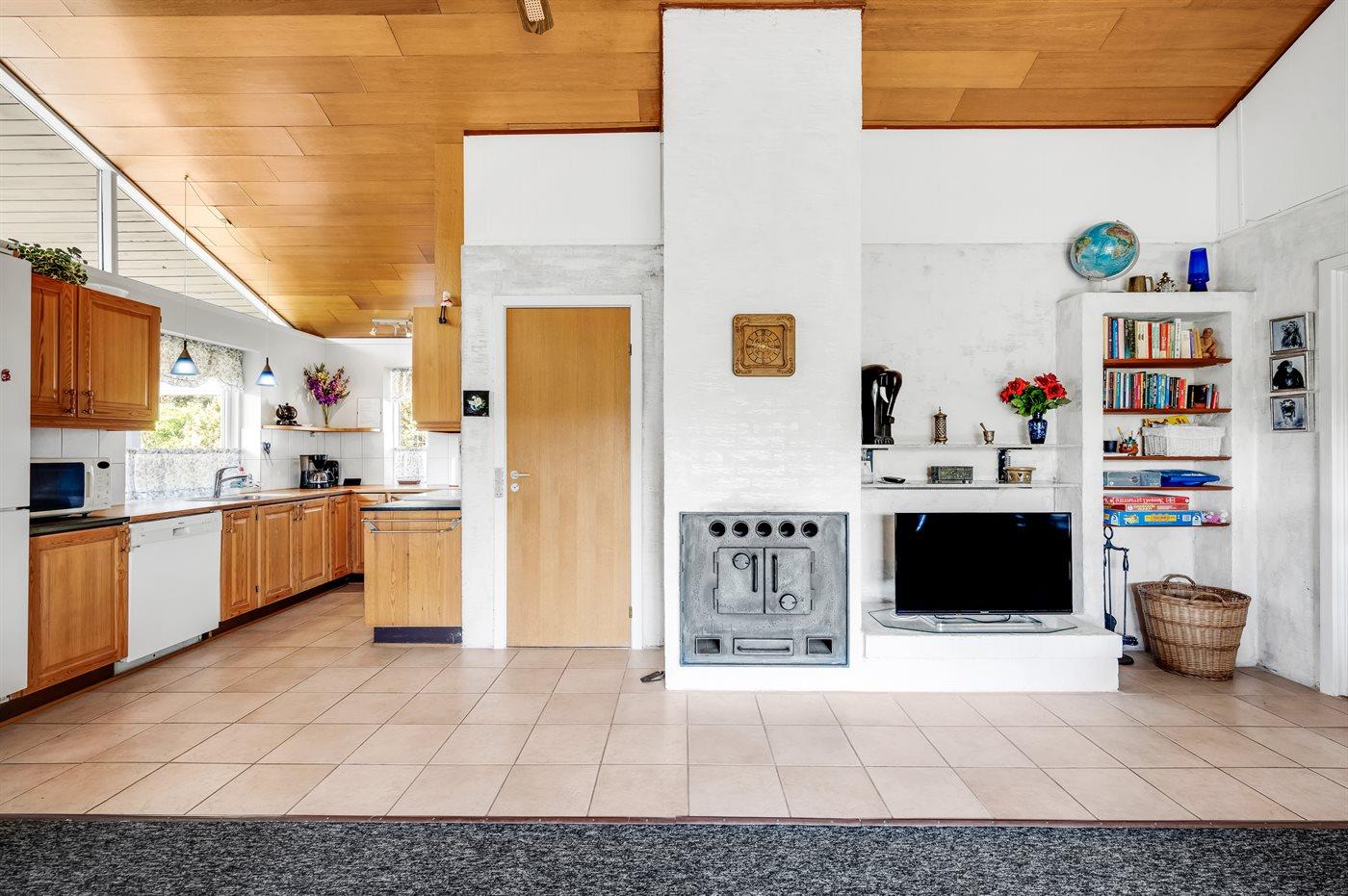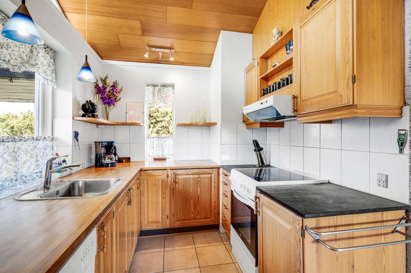 Køkkenet er udstyret med 1 køleskab. Der er 4 keramiske kogeplader, bageovn, mikrobølgeovn samt opvaskemaskine.