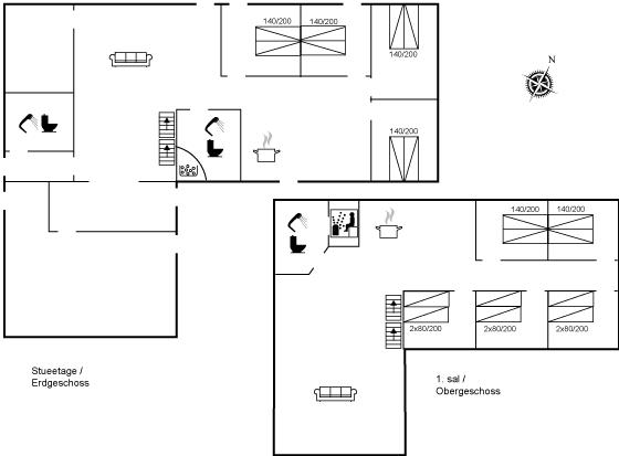 Der er i alt 9 soveværelser. Sovepladserne fordeler sig på: 12 sovepladser i dobbeltsenge. 6 sovepladser i enkeltsenge.