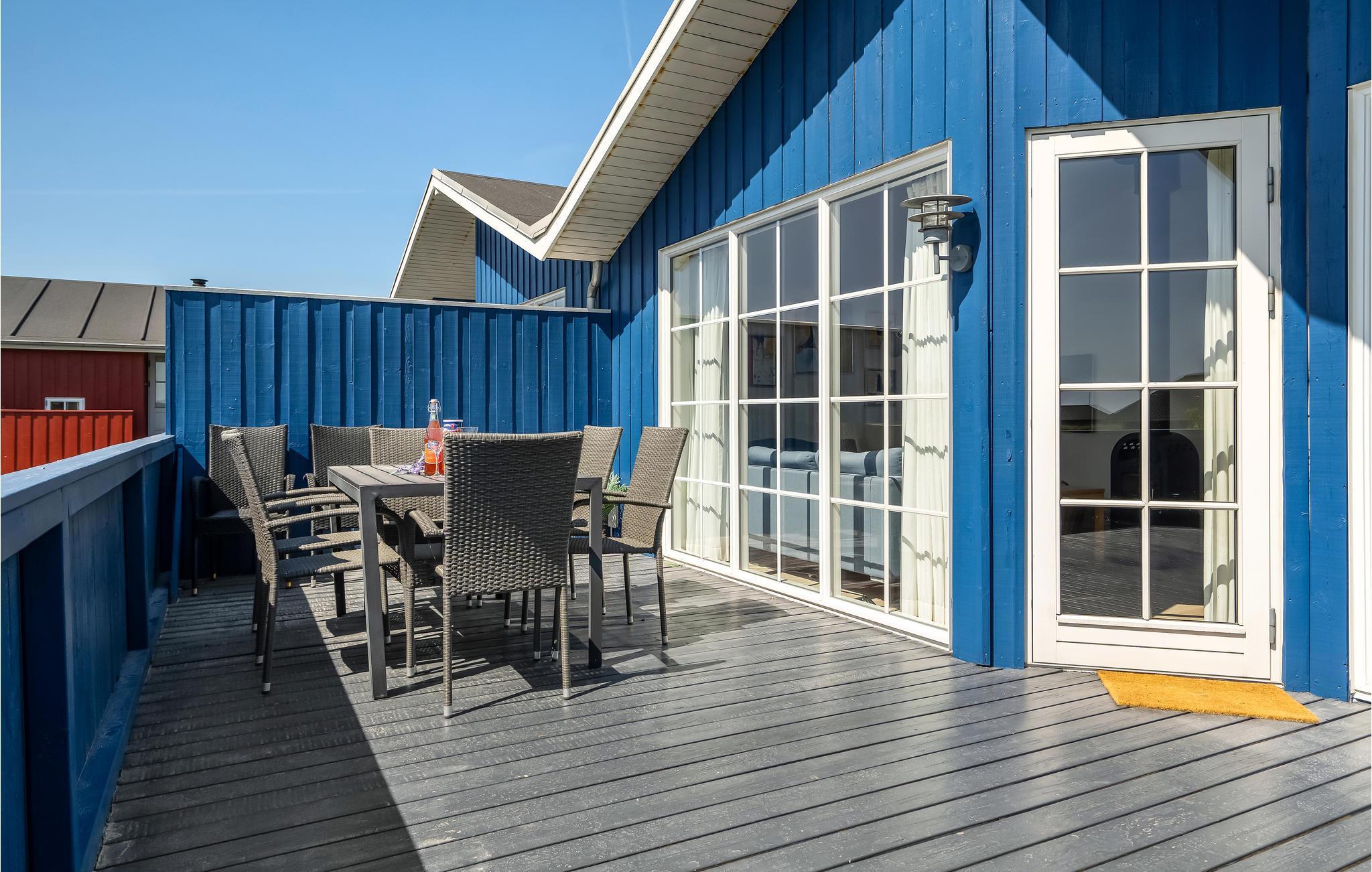 I Nørre Lyngvig ligger dette flotte hus, som virkelig springer i øjnene med sin friske, havblå farve. Huset har store glaspartier ud mod området, så der er et fantastisk lys overalt, og ikke mindst i opholdsrummet, hvor I får en skøn ramme om dagens måltider. Begynd jeres morgener med en kop friskbrygget kaffe og tag den med ud på terrassen, hvor I kan planlægge dagens aktiviteter. Om eftermiddagen er det skønt at smide sig i en liggestol med en god krimi, mens børnene leger i haven. Hvis I skal gøre noget godt for jer selv oven på dagens mange indtryk, kan I læne jer tilbage i den udendørs whirlpool.