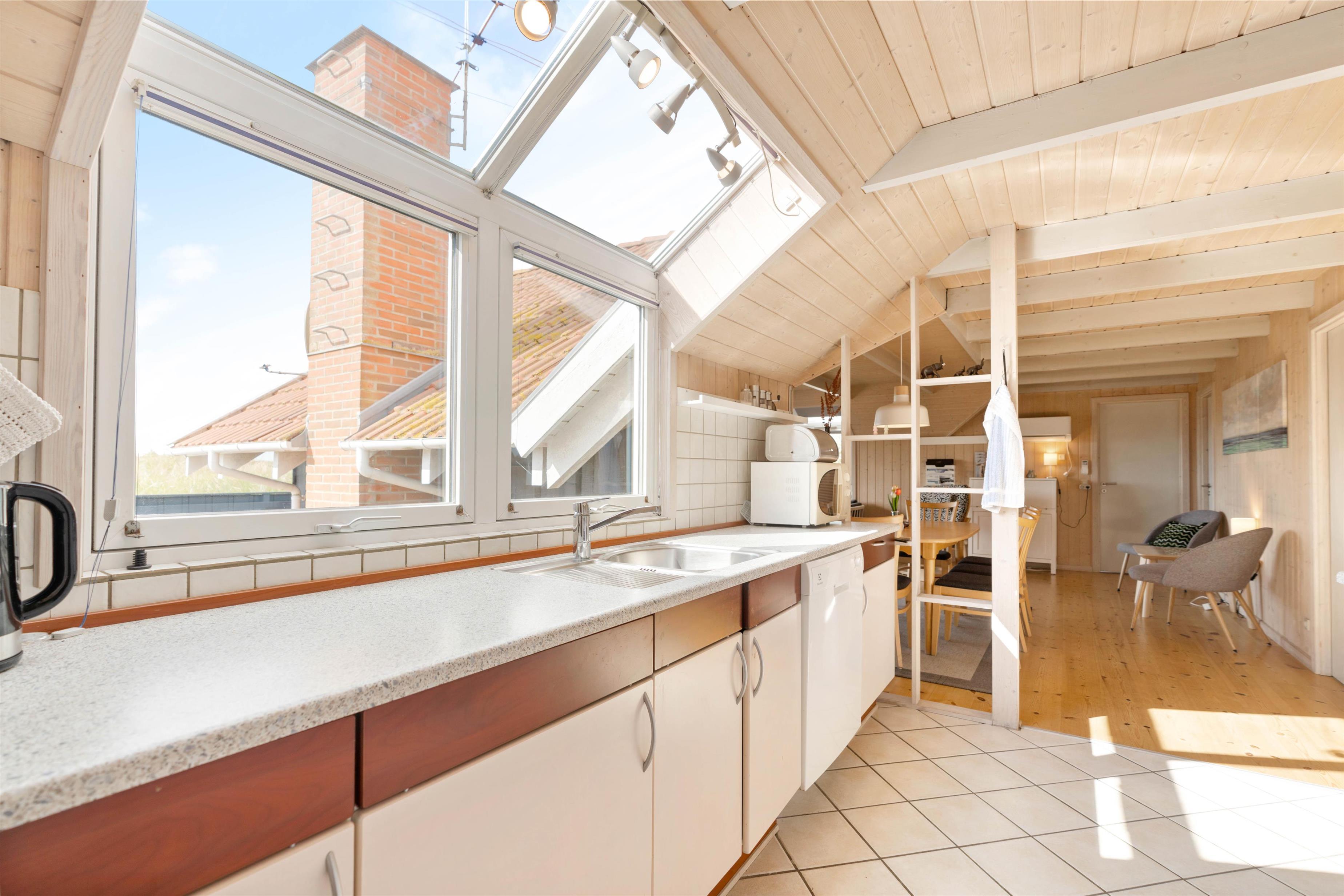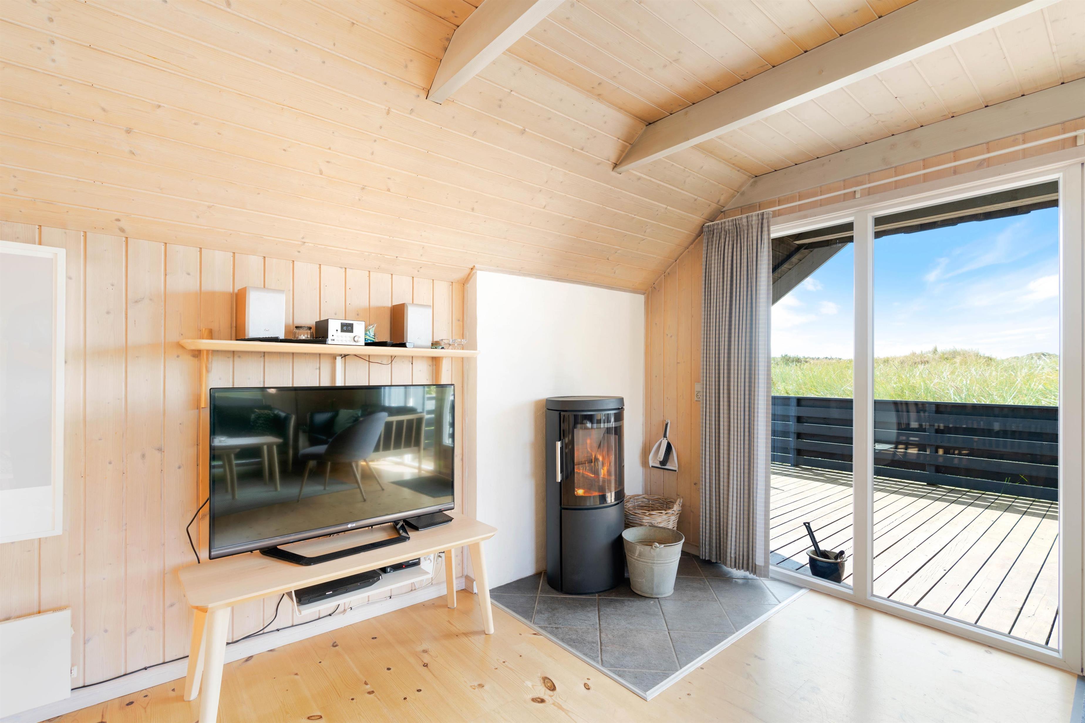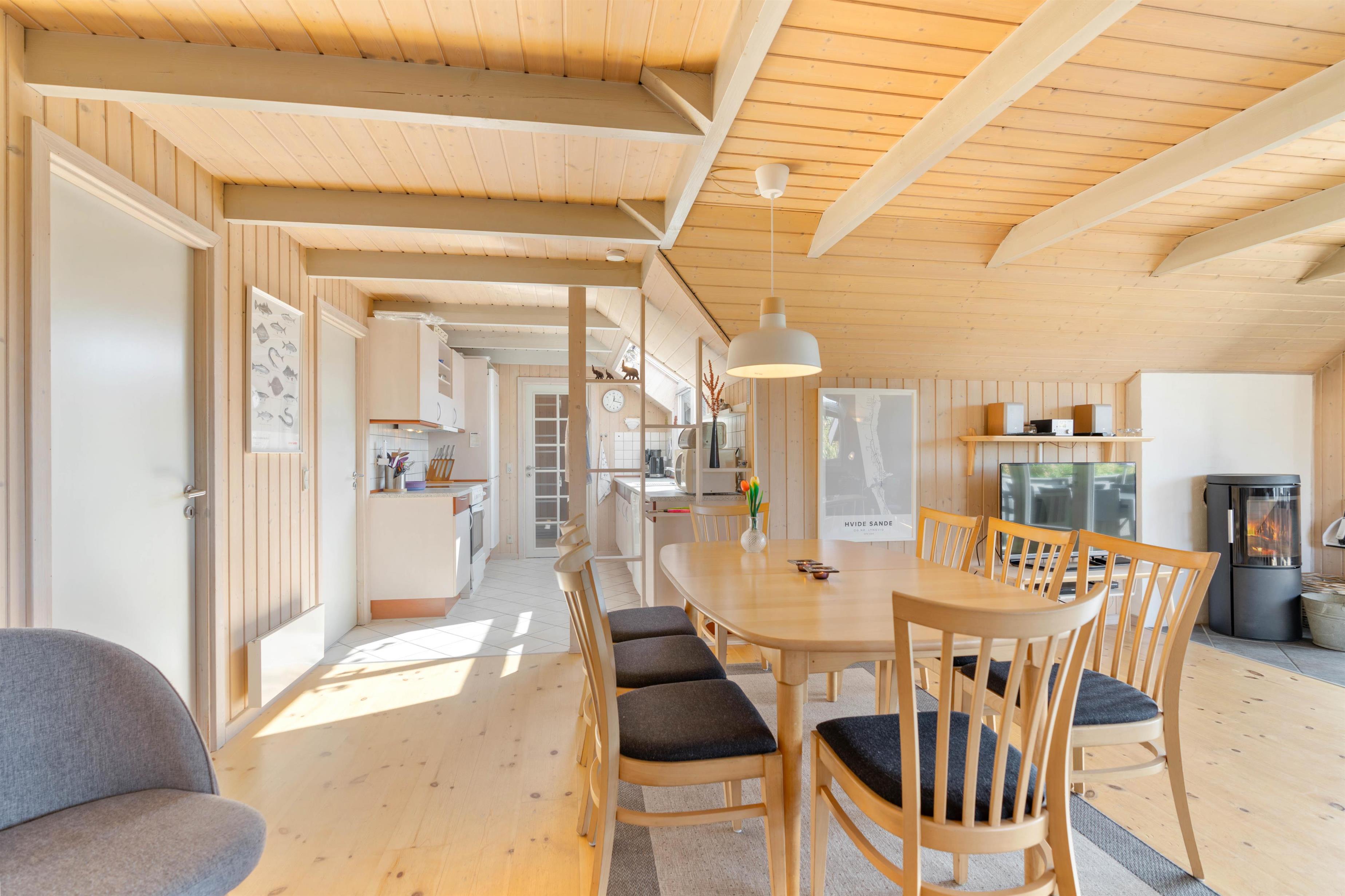 Huset har mange af de moderne faciliteter der bliver efterspurgt, kombineret med en fred og ro der tilbydes i dette område, som kan være medvirkende til en skøn ferie ved Vestkysten. I sommerhuset er køkkenalrummet husets hjerte, her vil størstedelen af jeres hygge stunder formegentlig foregå. Her kan I nyder varmen fra brændeovnen. I det funktionelle køkken er der alle de nødvendige redskaber for at lave en lækkert måltid, mens man nyder den skønne udsigt.