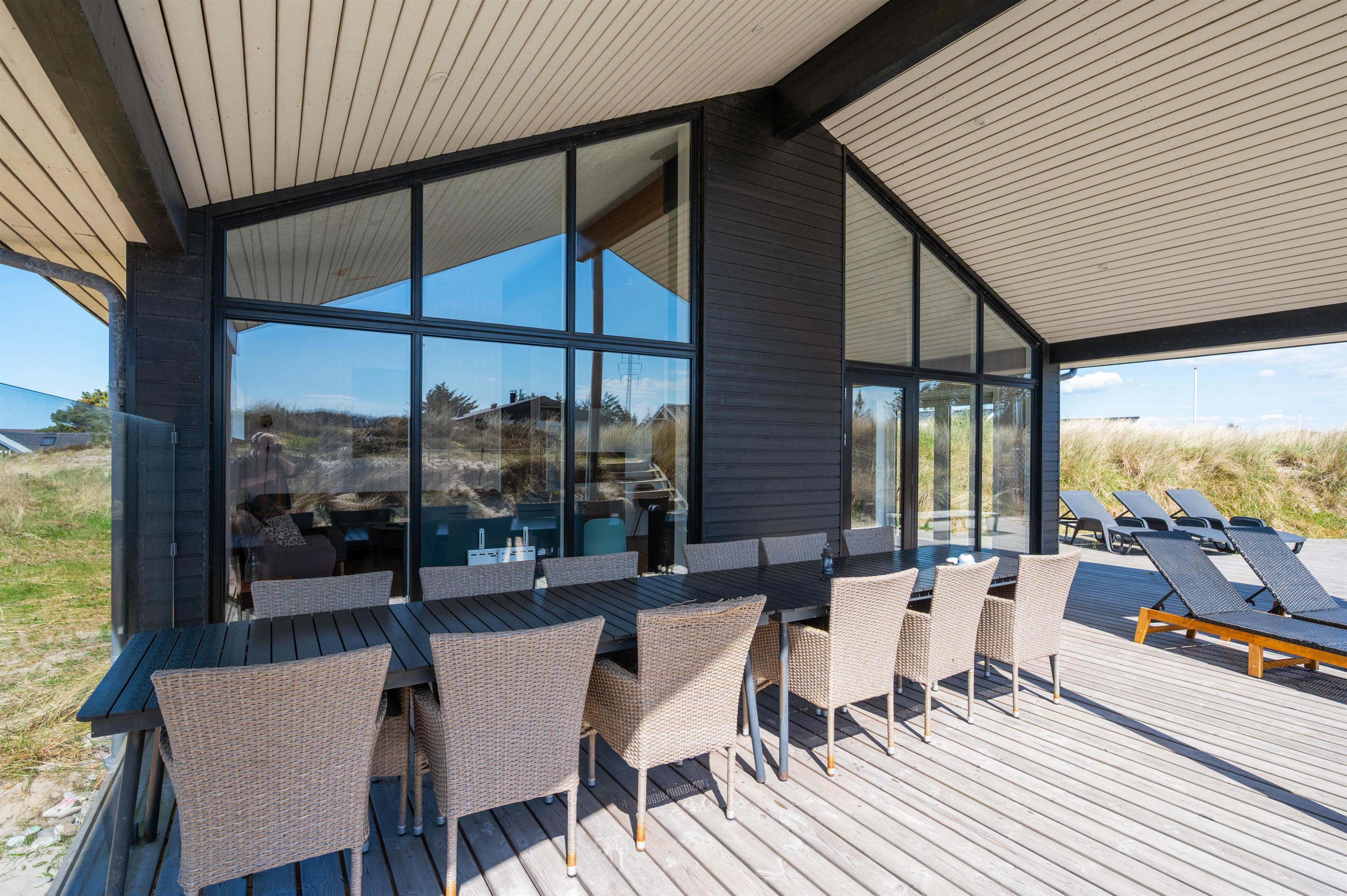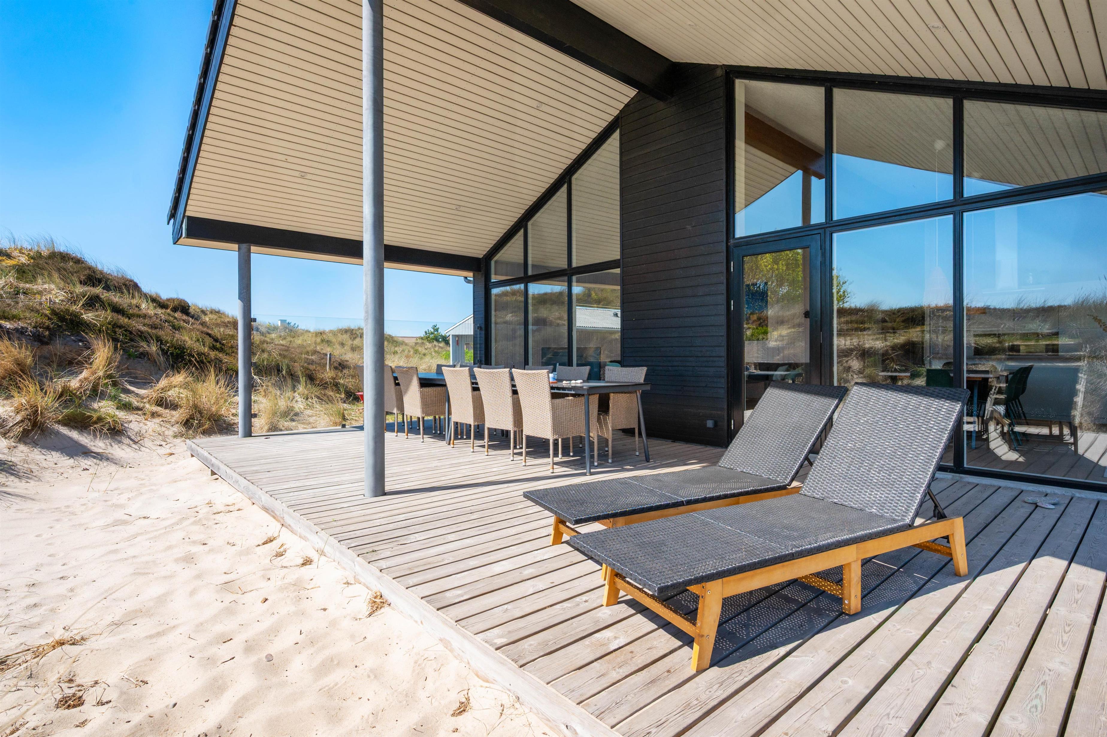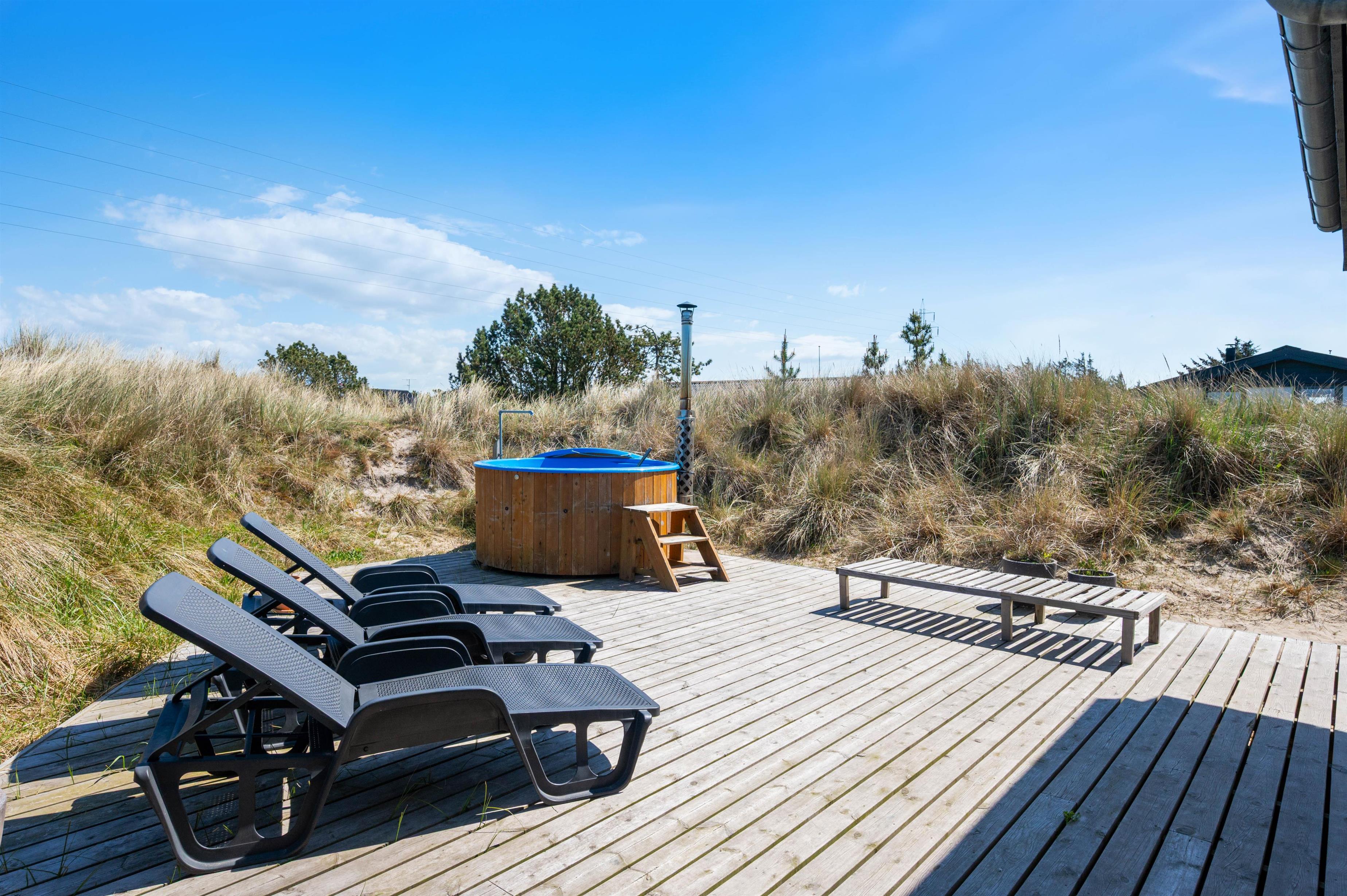 Efter en svømmetur i det brusende Vesterhav har I mulighed for at varme jer i feriehusets lækre vildmarksbad. Den store terrasse er udstyret med liggestole og grill, så I både kan nyde solens stråler og hygge jer med god mad og godt selskab udendørs. I forlængelse af terrassen, er der til feriehuset et stort område med det fineste strandsand, hvor børnene har rig mulighed for flere timers leg.