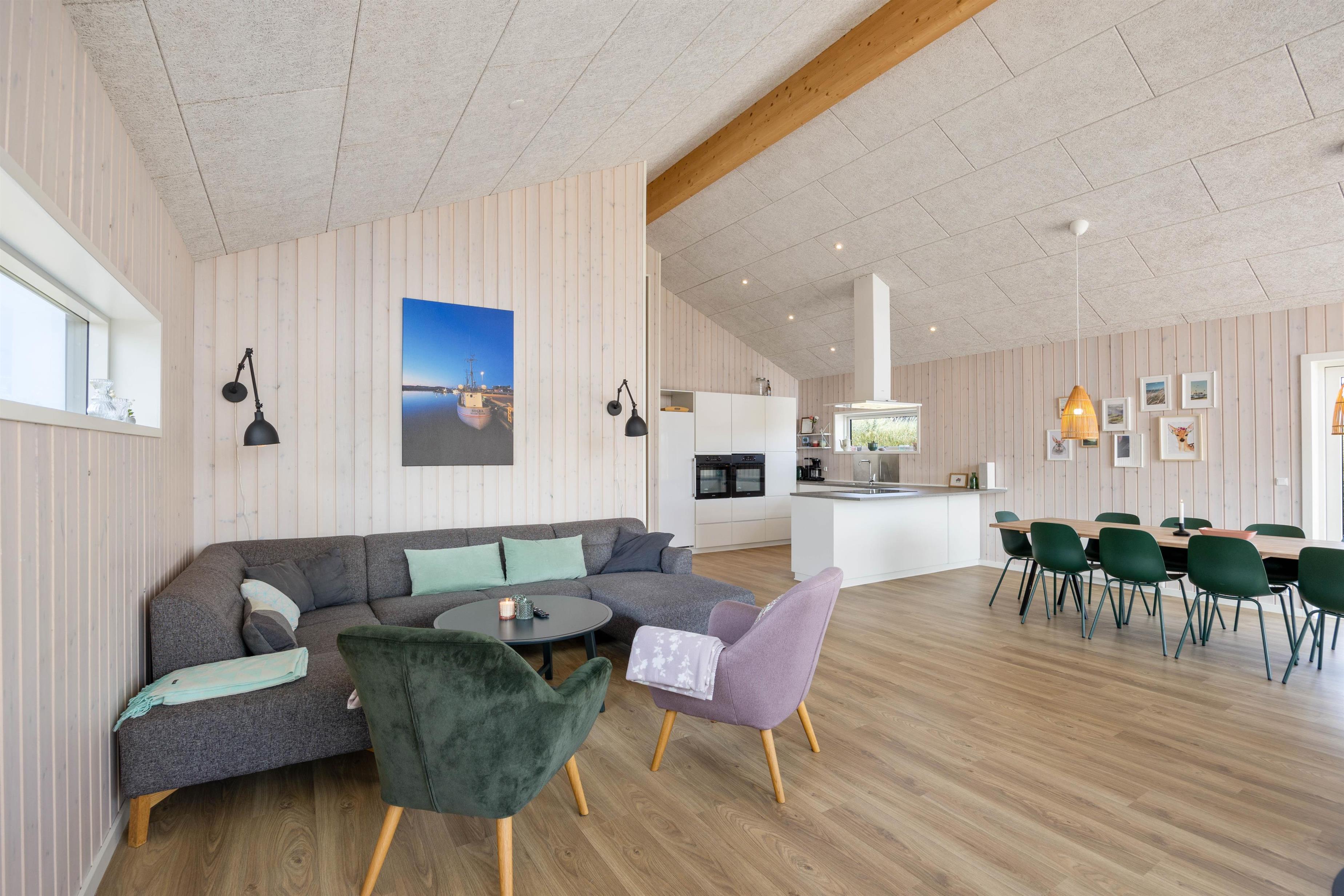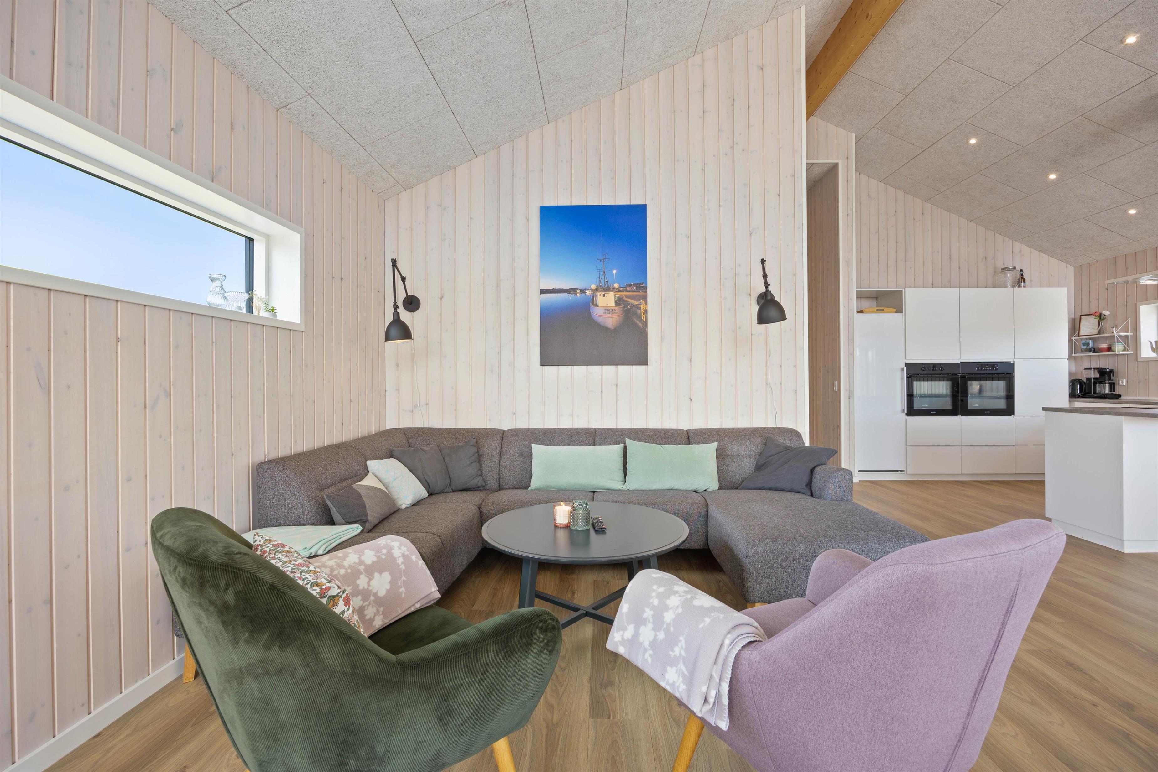 Sommerhusets indretning er lys og moderne og emmer af feriehygge og kvalitetstid med hele familien. Feriehusets samlingspunkt er det dejlige køkken-alrum med plads til godt selskab og mulighed for at nyde varmen fra feriehusets hyggelige brændeovn.