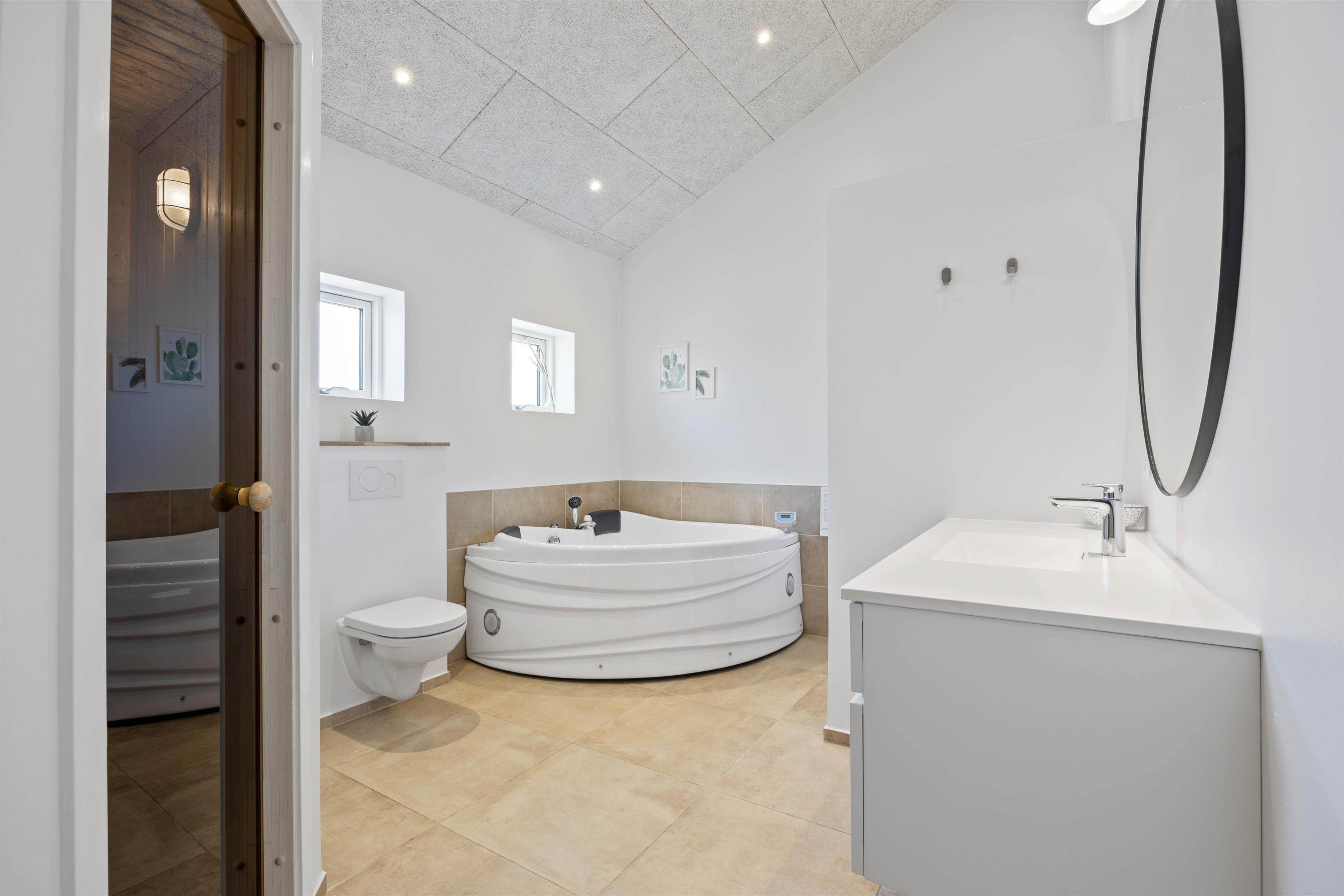 Hvis pulsen skal op, kan hele familien gå en tur i sommerhusets aktivitetsrum, der også har et tv. Her kan I finde en mester i bordfodbold eller i et spil pool. Efter en dag i aktivitetsrummet, eller en gåtur i den skønne vestjyske natur, inviterer sommerhuset til afslapning i saunaen eller det indendørs spabad.