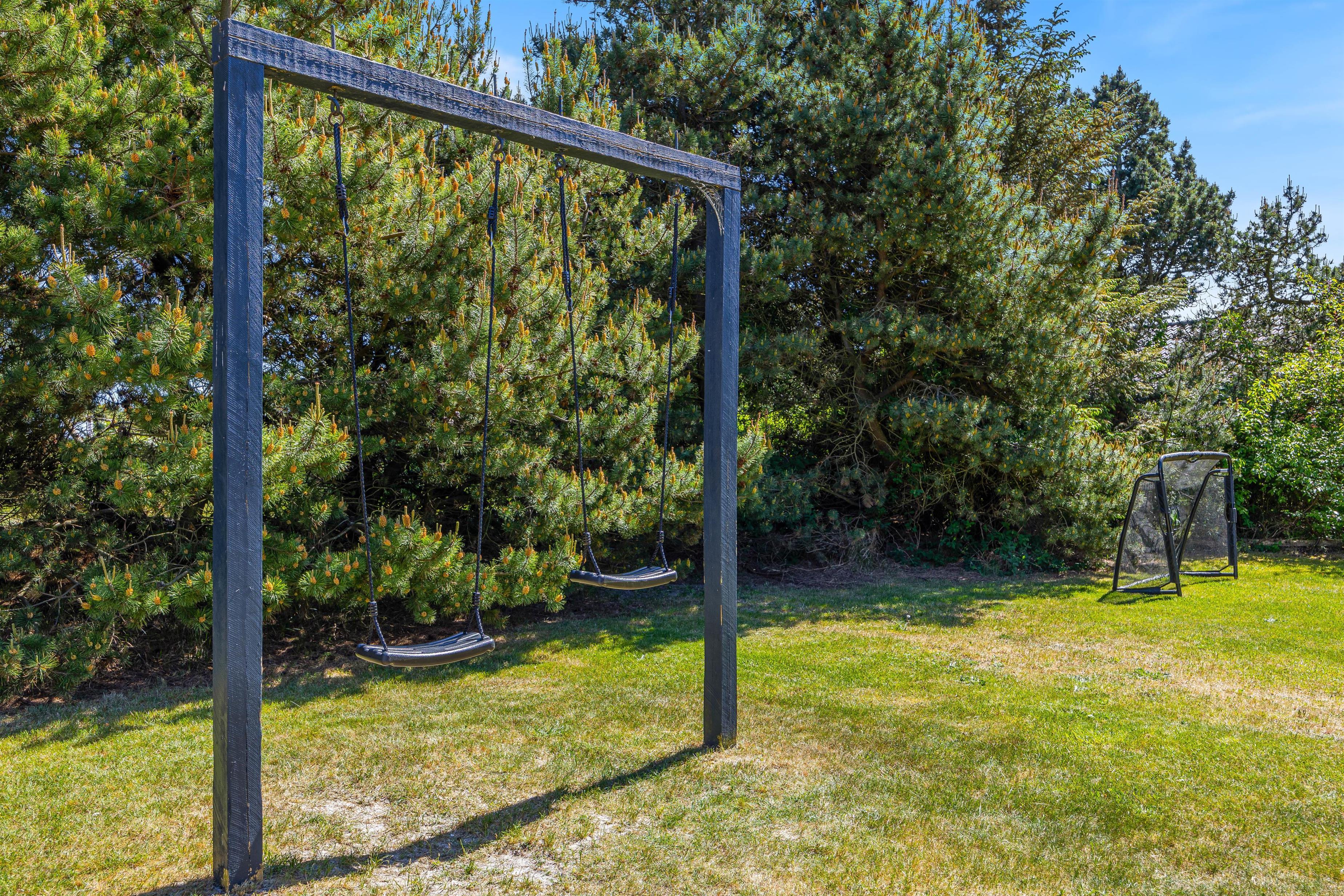 Fra stuen har I adgang til den store træterrasse fyldt med hyggekroge og en grøn græsplæne – perfekt til boldspil eller kongespil, mens de mindste kan få glæde af gyngestativet.