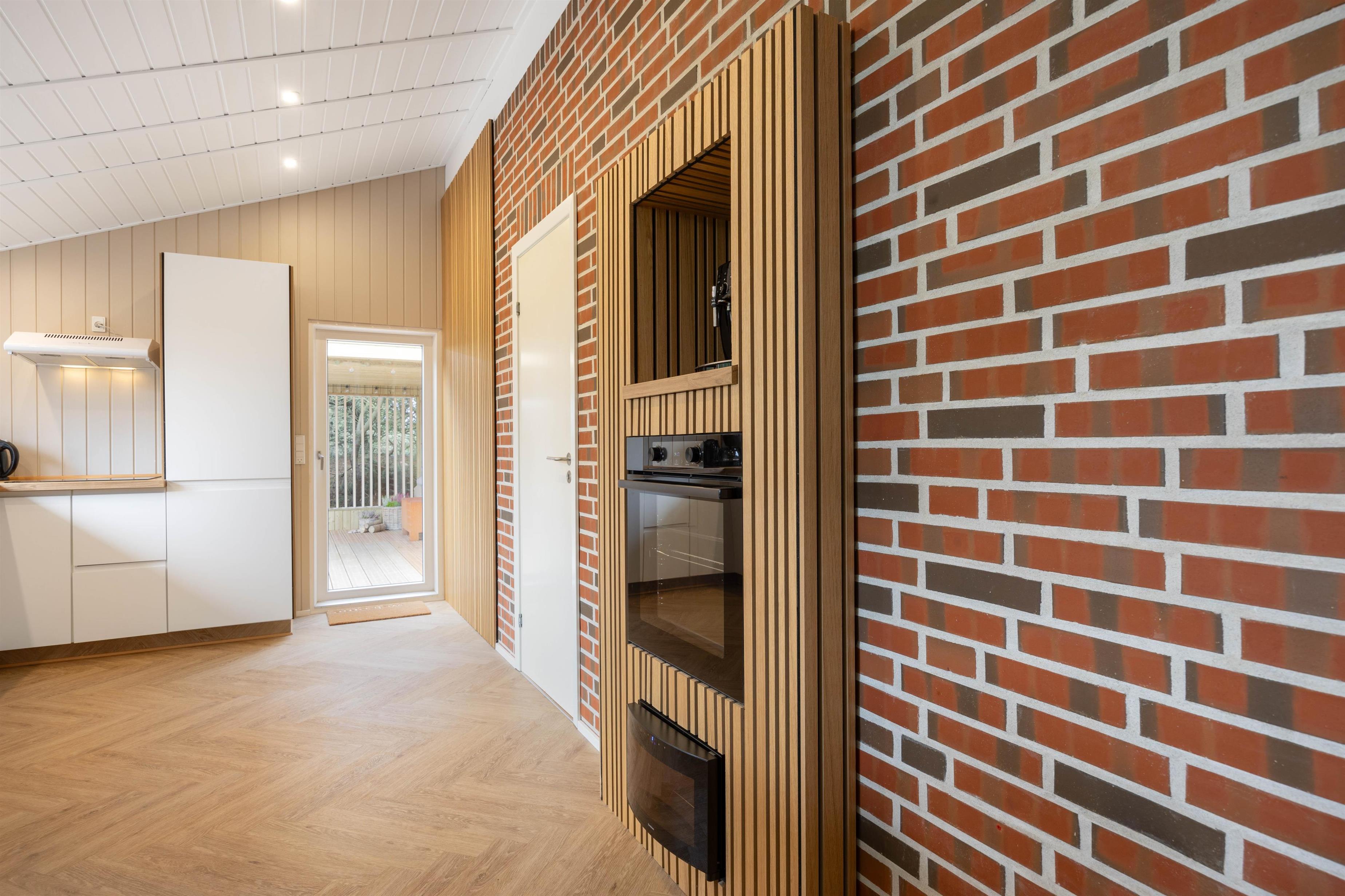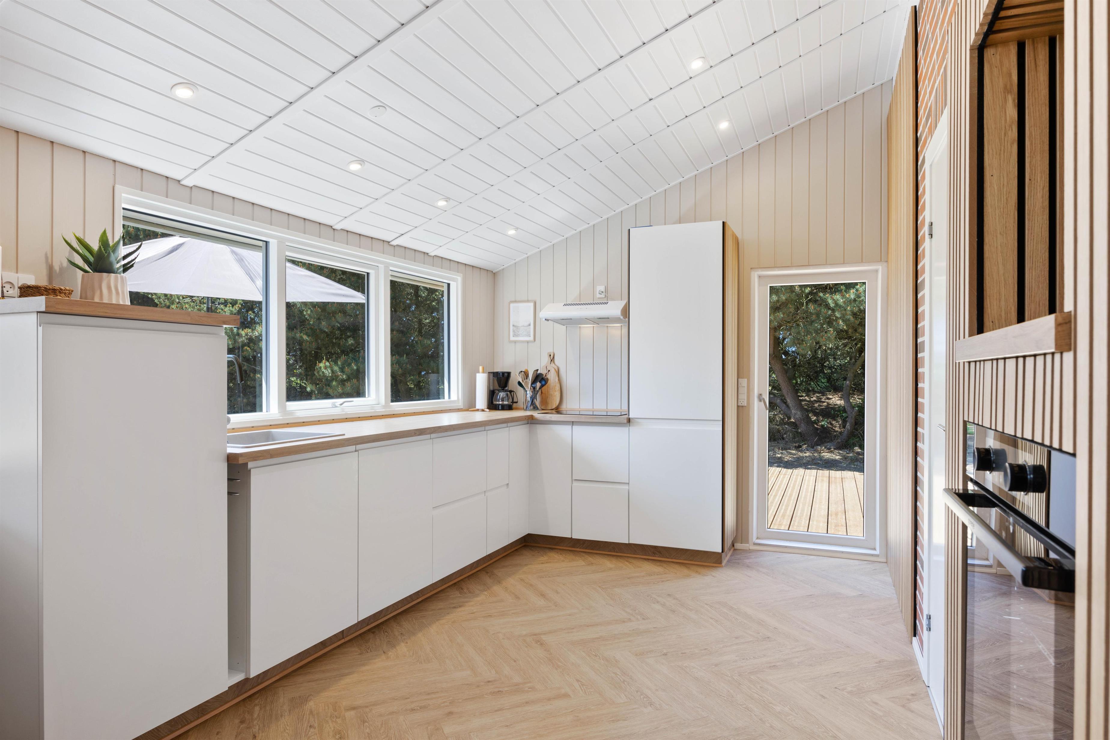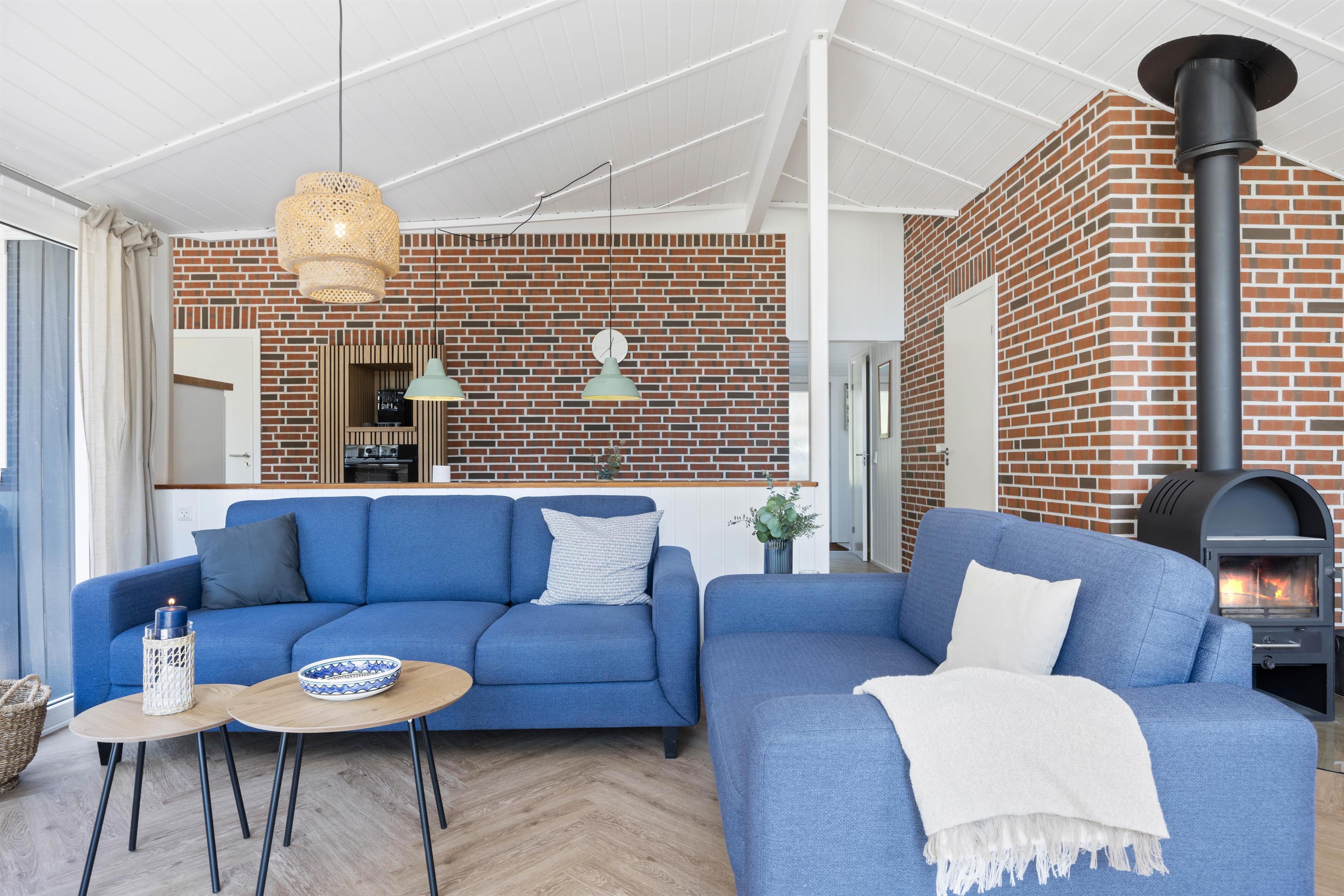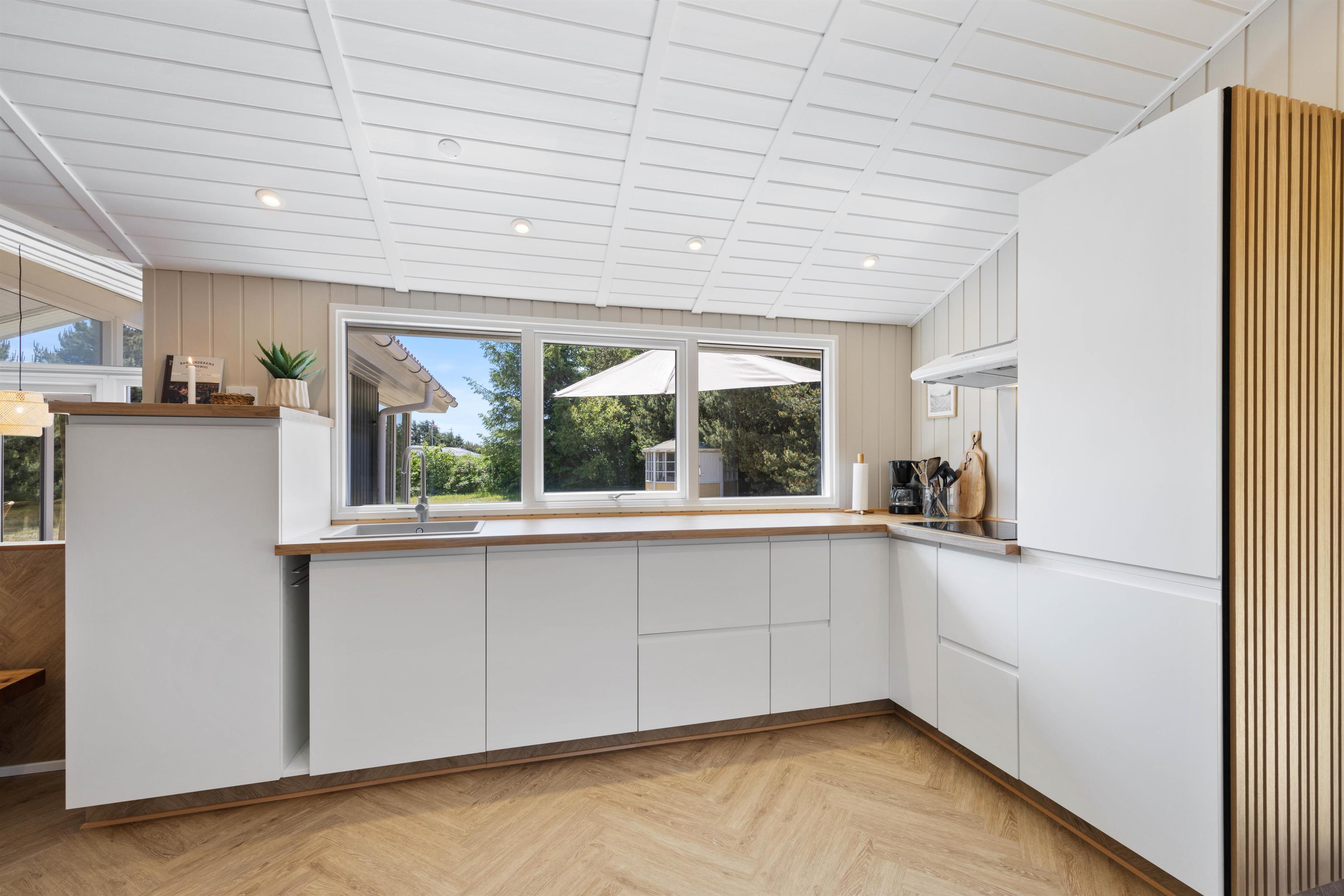 Sommerhusets hjerterum, er det dejlige alrum, hvor køkken og stue mødes. Her indbydes til hyggeligt samvær med familien, uanset om man laver mad eller slapper af i sofaen. Sæt jer godt til rette i den komfortable sofa med en god film eller bog og nyd de knitrende lyde fra brændeovnen. I stuens sydligste hjørne gemmer sig en hyggelig alkove, som både kan forvandles til en soveplads eller en lille hule, hvor børnene kan hygge sig med spil, imens aftensmaden bliver tilberedt i køkkenet. I køkkenet er alle de nødvendige faciliteter for at lave lækre måltider.