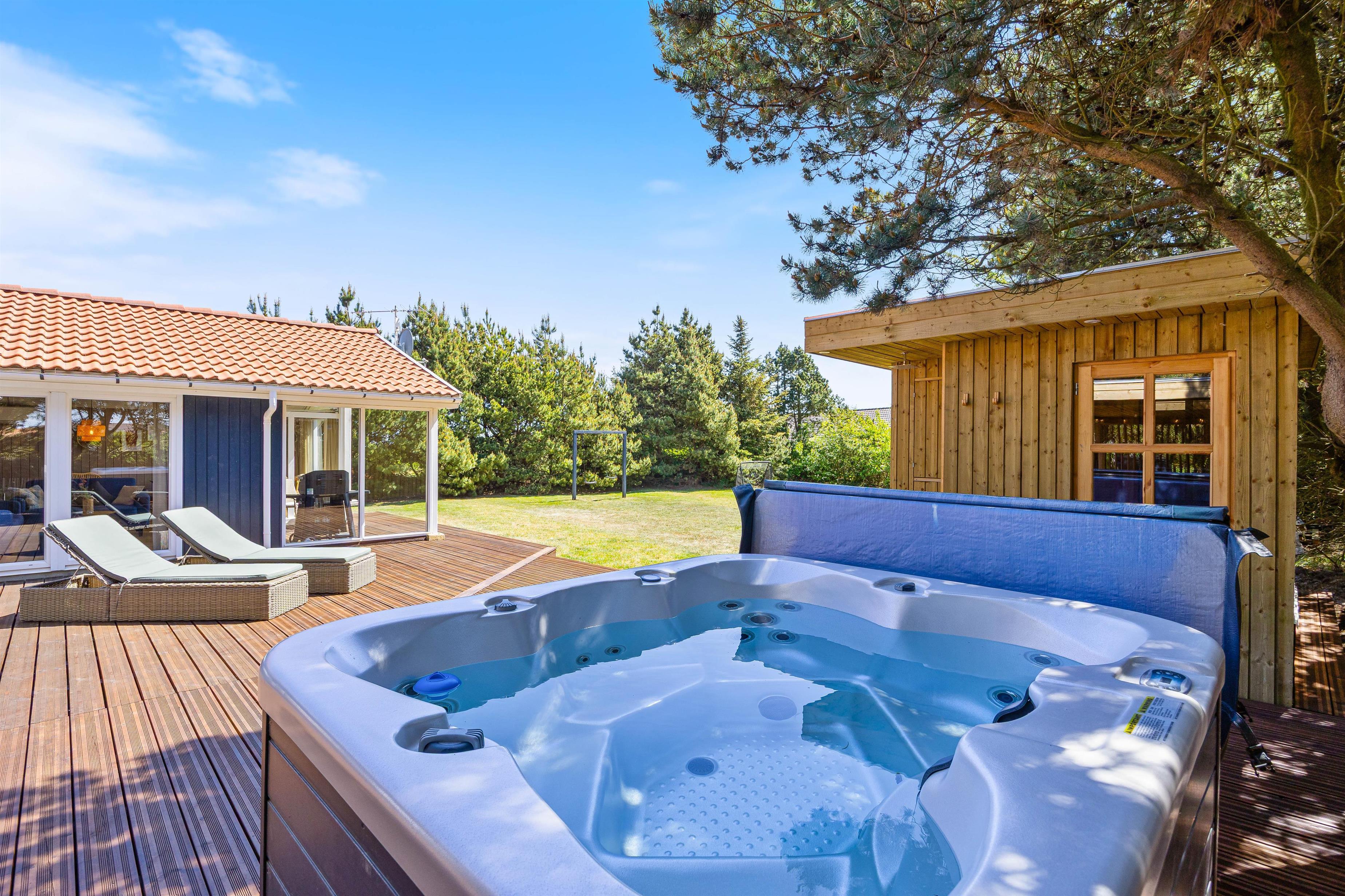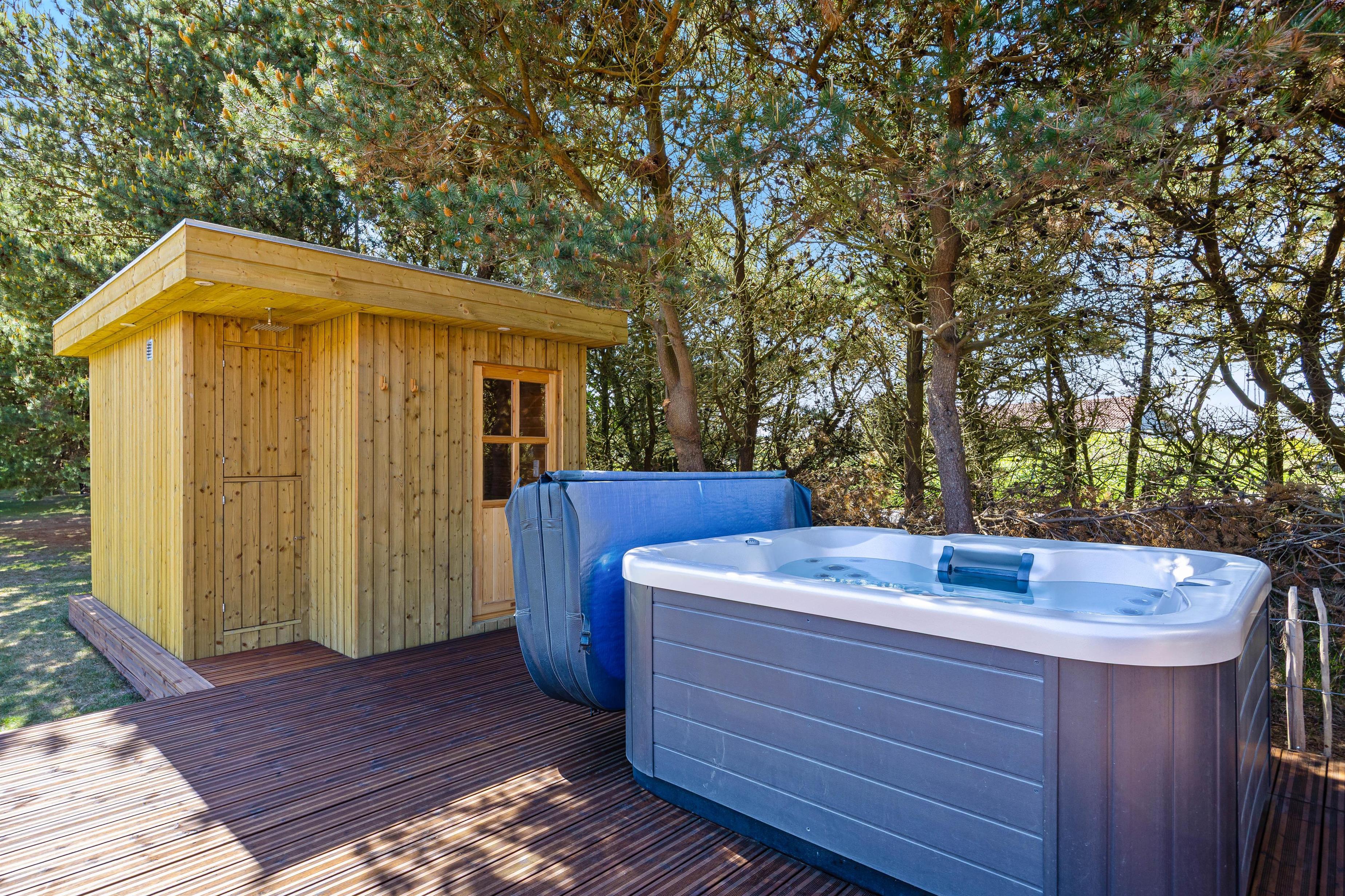 Når I trænger til at komme helt ned i gear, kan I sætte jer ned i spaen eller ind i saunen på terrassen og nyde den skønne udsigt udover Nr. Lyngvig Fyr. Drømmer I om tage et udendørsbad i den friske Vesterhavsluft, har I mulighed for at gøre dette ved sommerhuset. I skal dog være opmærksomme på, at udebruseren kun er tilgængelig fra april til november.