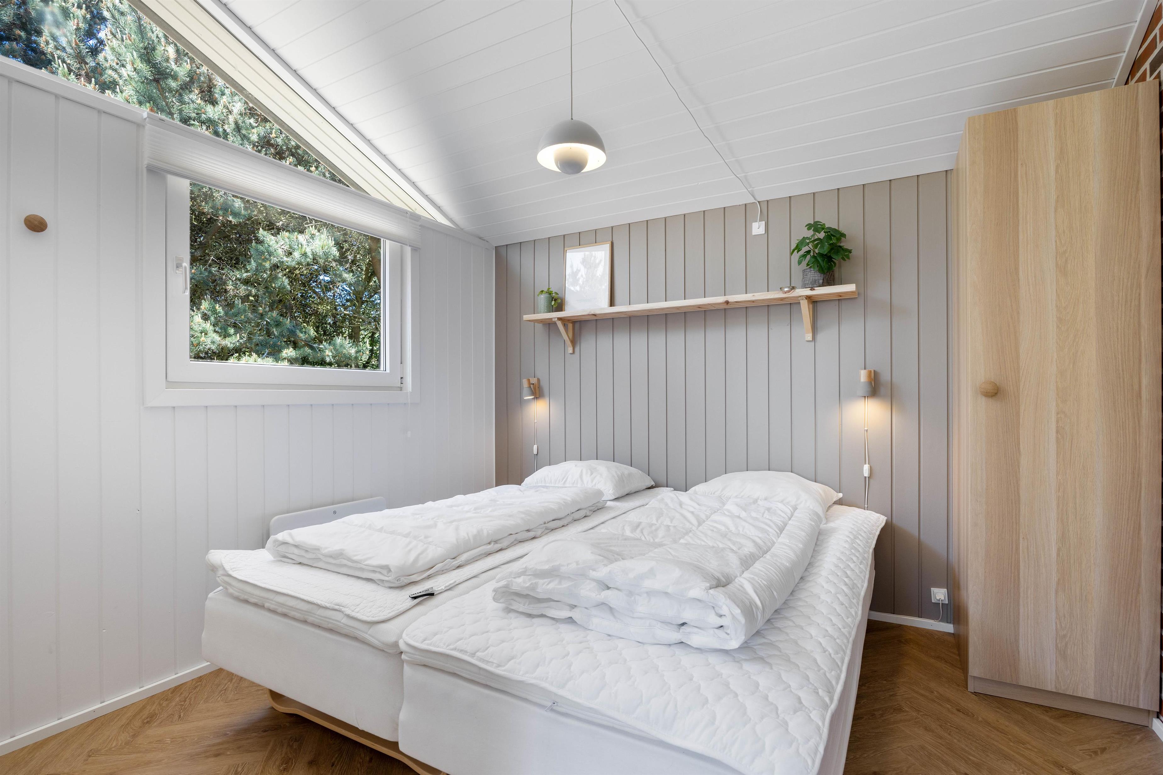 De 6 sovepladser i sommerhuset fordeler sig på 3 gode soveværelser hvoraf det ene værelse har adgang til 1 af de 2 badeværelser. Soverummene er alle indrettet med gode senge samt et skab med fin plads til opbevaring. Det ene soveværelse har eget bad, mens det andet badeværelse er udstyret med vaskemaskine.