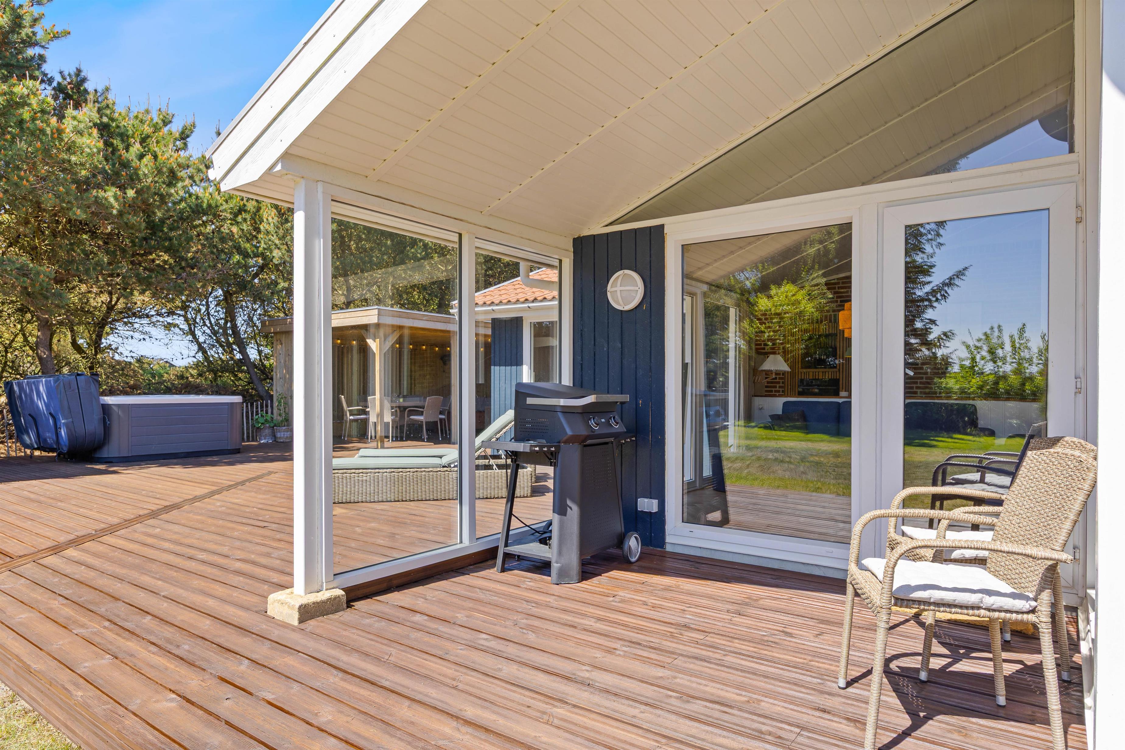 Med det samme I træder ud på terrassen vil I mærke den hyggelige atmosfære. Nyd solens varme fra liggestolene eller tag plads om havebordet, hvor I kan nyde en frokost - her kan I også nyde aftensmaden, som naturligvis er tilberedt på grillen.