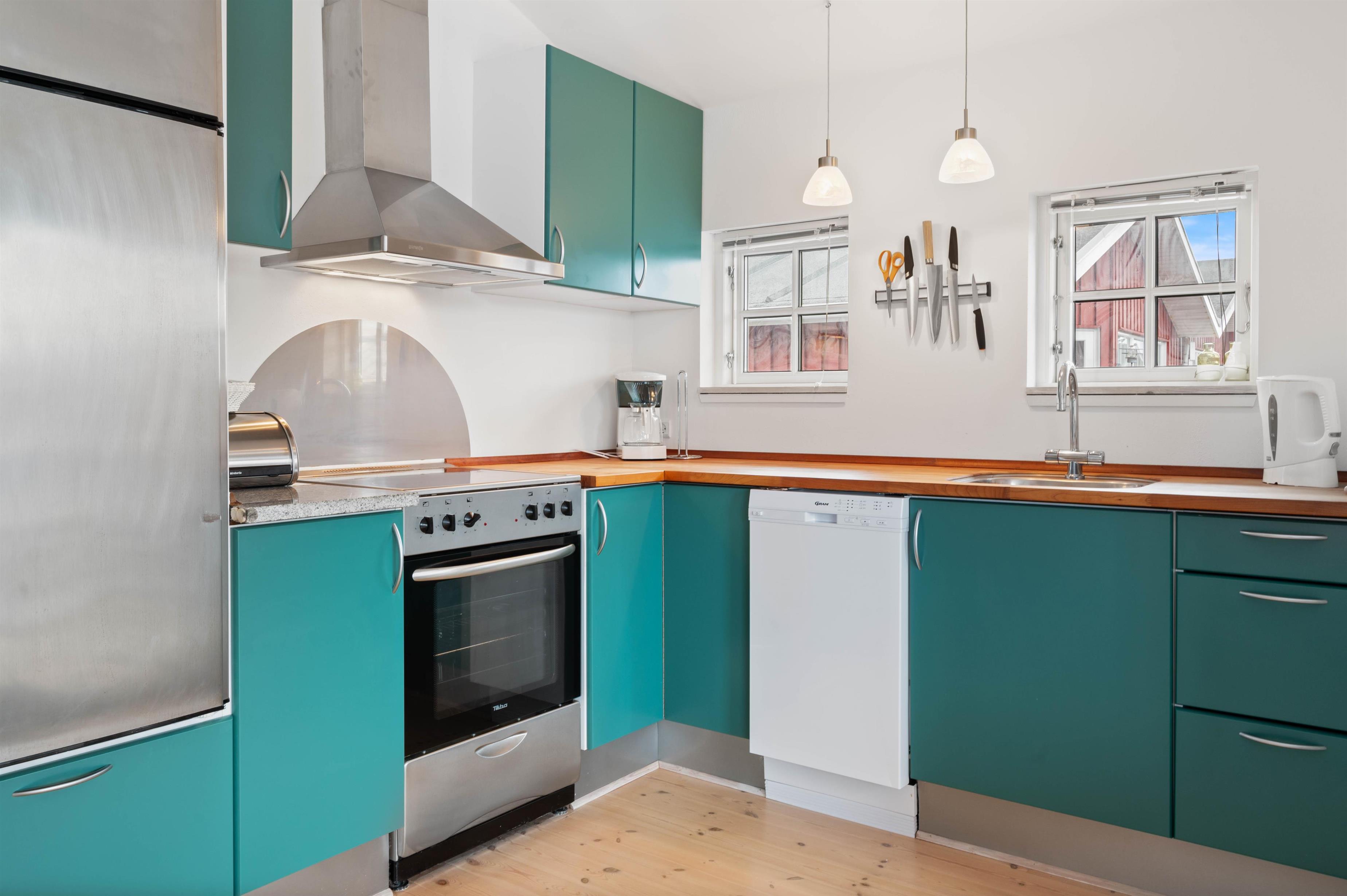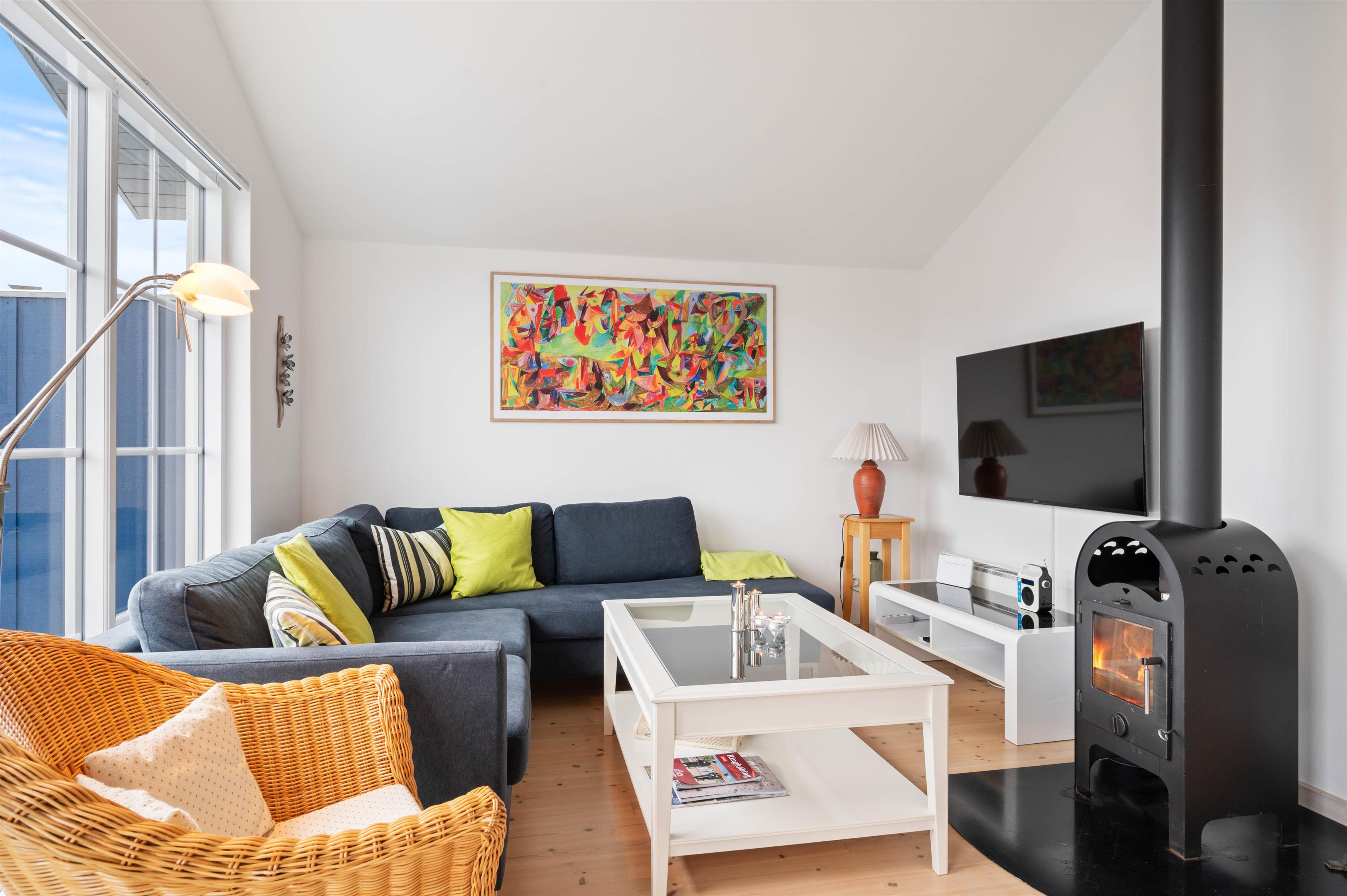 Opholdsstuen er samlingspunktet i feriehuset for mange hyggelige timer. Uanset om det er med en god film i fjernsynet eller hygge omkring tilberedningen af aftenens måltid - Med en lækker middag omkring spisebordet efterfølgende, så er I garanteret hygge i hinandens selskab. Samtidig med dette har I mulighed for at nyde den lune knitren fra brændeovnen, og dermed opleve den ægte sommerhusstemning i feriehuset.