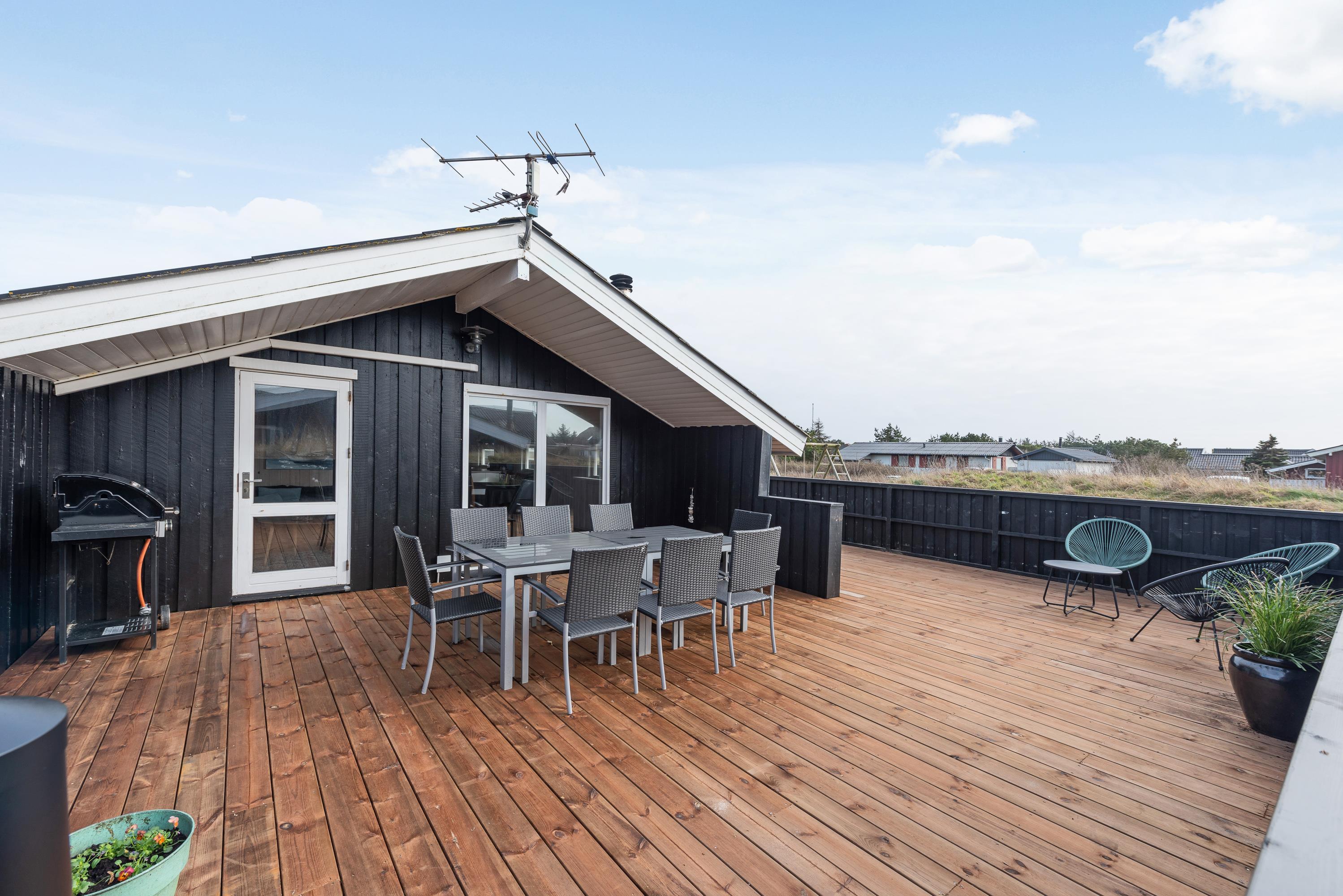 Feriehusets terrasse er for nyligt blevet udvidet, hvilket har resulteret i en stor, lukket terrasse med masser af plads til at nyde den friske luft. Her kan I også uden problemer lukke hundene ud.
