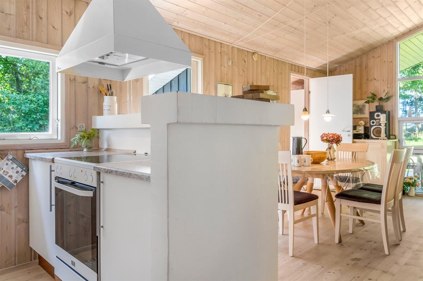 Køkkenet er udstyret med 1 køleskab. Der er 4 keramiske kogeplader, varmluftovn samt opvaskemaskine.