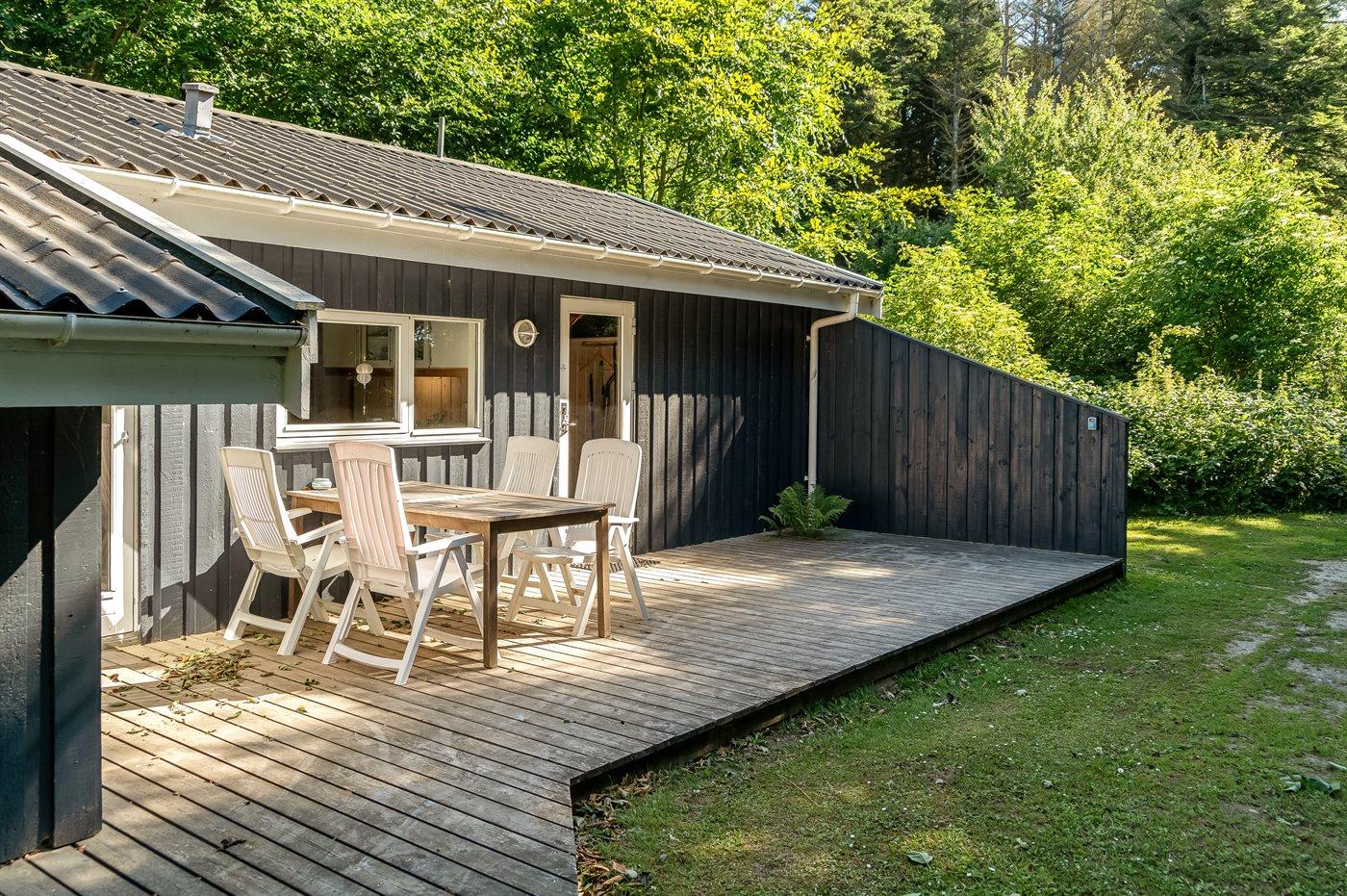 Ferieboligen er beliggende på en 2260 m² stor naturgrund. Der er 650 m til havet. Nærmeste forretning er beliggende i en afstand af 6000 m. Til ferieboligen hører 38 m² terrasseareal. Desuden er der 6 m² overdækket terrasse. Der er redskabsrum. Gynge. Grill til rådighed. Parkering ved ferieboligen.