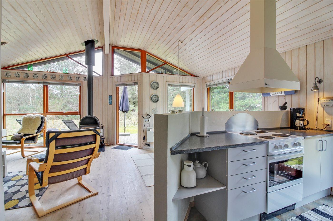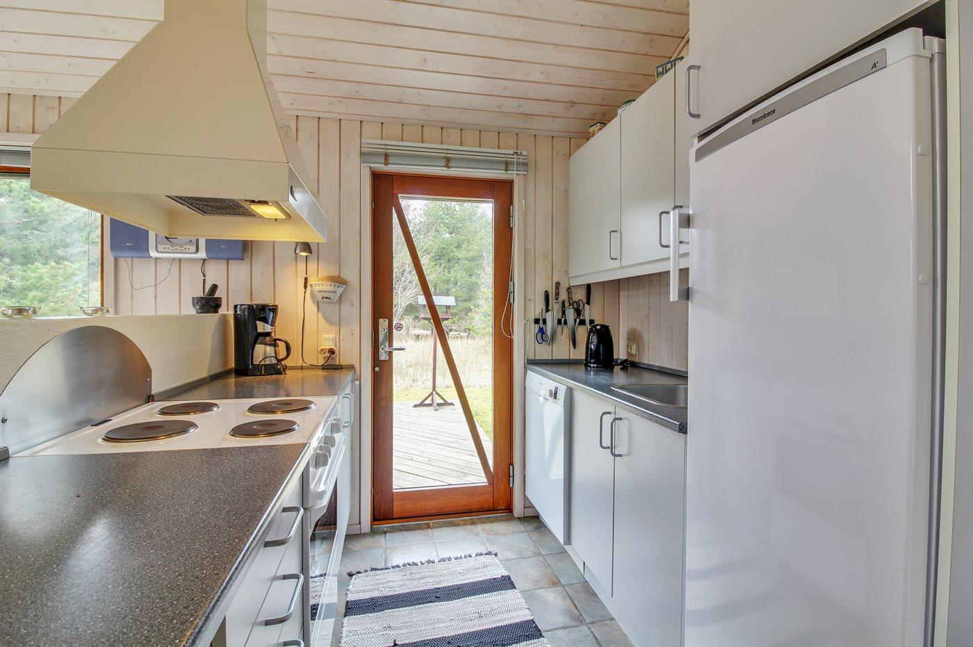 Køkkenet er udstyret med 1 køleskab. Der er 4 elkogeplader, varmluftovn, mikrobølgeovn samt opvaskemaskine.