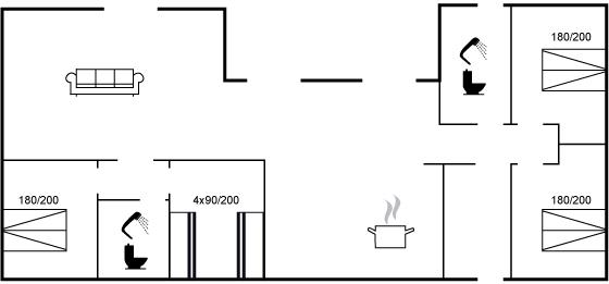 Der er i alt 4 soveværelser. Sovepladserne fordeler sig på: 6 sovepladser i dobbeltsenge. 4 sovepladser i køjesenge. 2 sovepladser på madrasser. 2 af disse sovepladser befinder sig på husets hems.