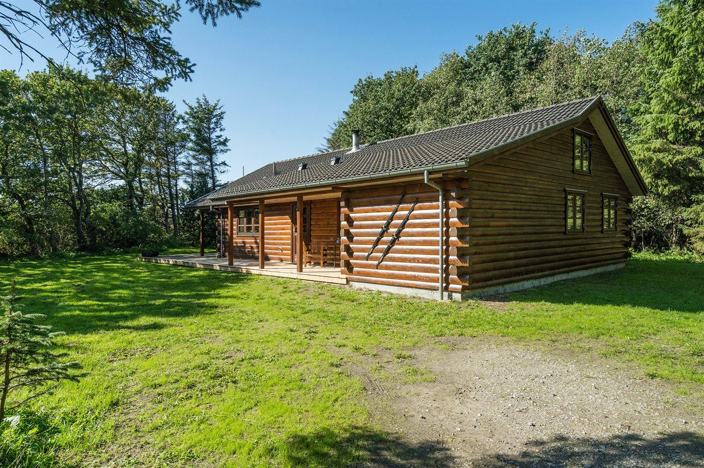 Lyst bjælkesommerhus i Løkken med rolig, ugenert beliggenhed på stor naturgrund nær havet.